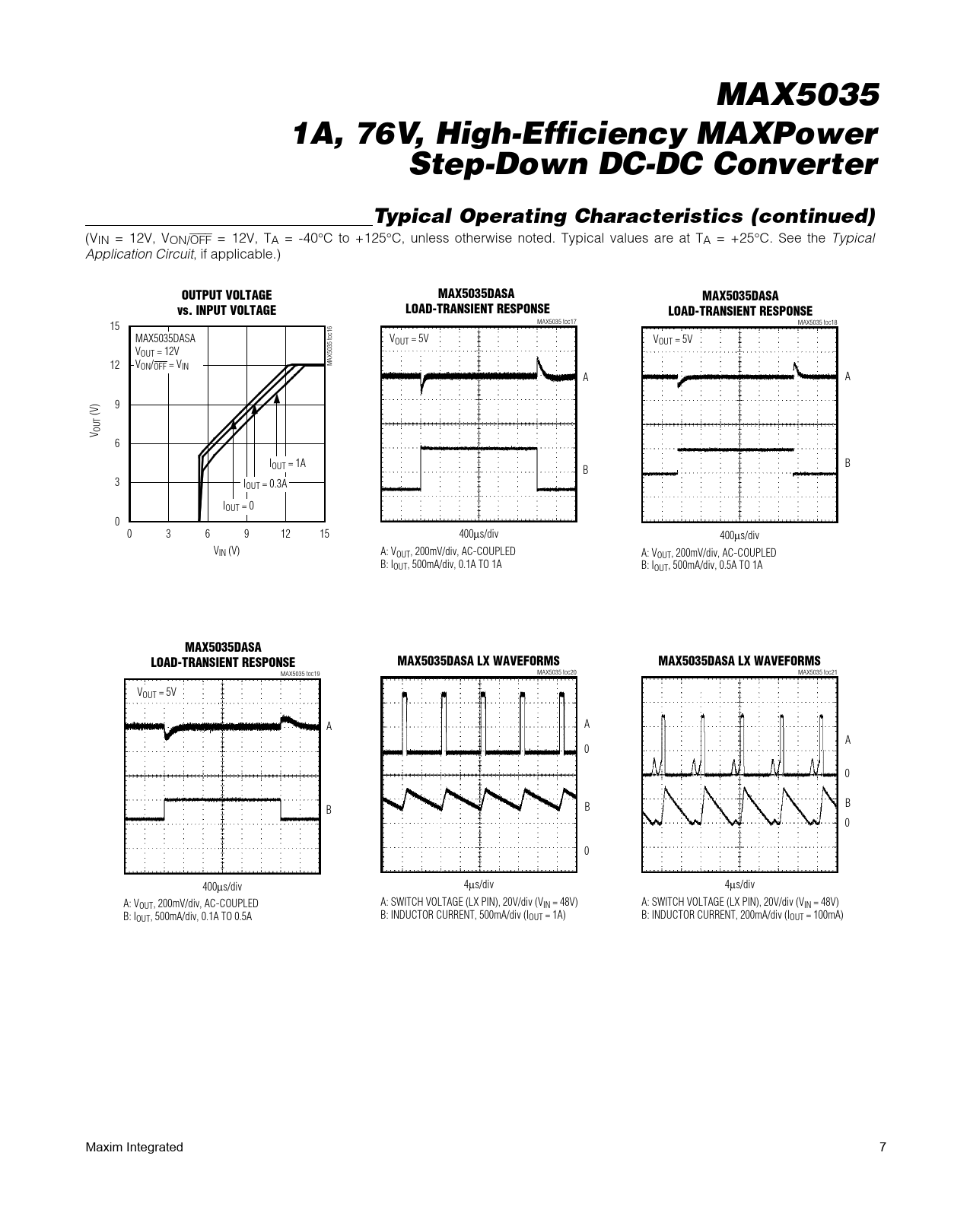 15 MAX5035 toc17 MAX5035 toc18 MAX5035DASA VOUT = 5V VOUT = 5V VOUT = 12V MAX5035 toc16 12 VON/OFF = VIN A A 9 (V) V OUT 6 IOUT = 1A B B 3 IOUT = 0.3A IOUT = 0 0 0 3 6 9 12 15 400µs/div 400µs/div VIN (V) A: VOUT, 200mV/div, AC-COUPLED A: VOUT, 200mV/div, AC-COUPLED B: IOUT, 500mA/div, 0.1A TO 1A B: IOUT, 500mA/div, 0.5A TO 1A