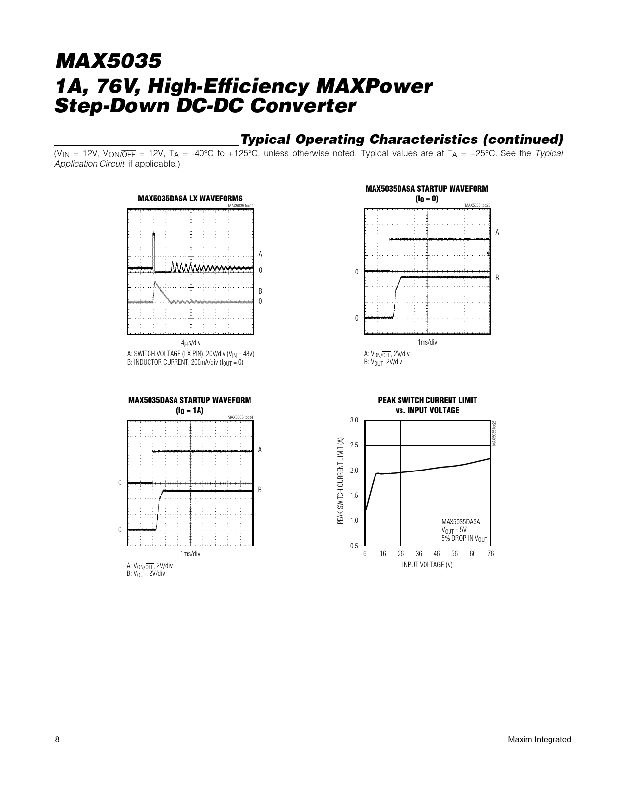 MAX5035 toc24 3.0 MAX5035 toc25 2.5 A 2.0 0 B 1.5 PEAK SWITCH CURRENT LIMIT (A) 1.0 MAX5035DASA 0 VOUT = 5V 5% DROP IN VOUT 0.5 1ms/div 6 16 26 36 46 56 66 76 A: VON/OFF, 2V/div INPUT VOLTAGE (V) B: VOUT, 2V/div 8 Maxim Integrated