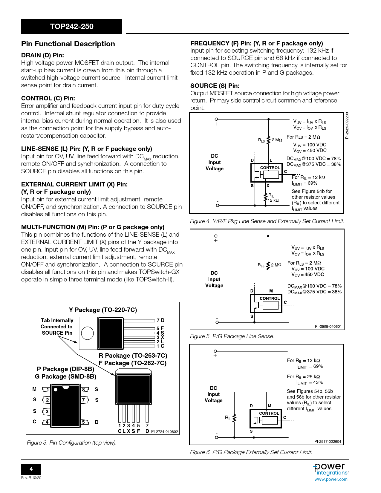 TOP242-250Pin Functional DescriptionFREQUENCY (F) Pin: (Y, R or F package only) Input pin for selecting switching frequency: 132 kHz if DRAIN (D) Pin: connected to SOURCE pin and 66 kHz if connected to High voltage power MOSFET drain output. The internal CONTROL pin. The switching frequency is internally set for start-up bias current is drawn from this pin through a fixed 132 kHz operation in P and G packages. switched high-voltage current source. Internal current limit sense point for drain current. SOURCE (S) Pin: Output MOSFET source connection for high voltage power CONTROL (C) Pin: return. Primary side control circuit common and reference Error amplifier and feedback current input pin for duty cycle point. control. Internal shunt regulator connection to provide internal bias current during normal operation. It is also used + VUV = IUV x RLS as the connection point for the supply bypass and auto- VOV = IOV x RLS restart/compensation capacitor. For RLS = 2 M PI-2629-092203 R 2 M LS V LINE-SENSE (L) Pin: (Y, R or F package only) UV = 100 VDC VOV = 450 VDC Input pin for OV, UV, line feed forward with DC reduction, DC MAX DCMAX@100 VDC = 78% remote ON/OFF and synchronization. A connection to InputDL DCMAX@375 VDC = 38% SOURCE pin disables all functions on this pin. VoltageCONTROL C For RIL = 12 k EXTERNAL CURRENT LIMIT (X) Pin: I SX LIMIT = 69% (Y, R or F package only) See Figure 54b for R Input pin for external current limit adjustment, remote IL other resistor values - 12 k (R ON/OFF, and synchronization. A connection to SOURCE pin IL) to select different ILIMIT values disables all functions on this pin. Figure 4. Y/R/F Pkg Line Sense and Externally Set Current Limit. MULTI-FUNCTION (M) Pin: (P or G package only) This pin combines the functions of the LINE-SENSE (L) and EXTERNAL CURRENT LIMIT (X) pins of the Y package into one pin. Input pin for OV, UV, line feed forward with DC MAX reduction, external current limit adjustment, remote ON/OFF and synchronization. A connection to SOURCE pin Ω Ω disables all functions on this pin and makes TOPSwitch-GX operate in simple three terminal mode (like TOPSwitch-II). Y Package (TO-220-7C)Tab Internally7 DConnected to5 FSOURCE Pin4 S3 X Figure 5. P/G Package Line Sense. 2 L1 CR Package (TO-263-7C) + F Package (TO-262-7C) For RIL = 12 k P Package (DIP-8B) ILIMIT = 69% G Package (SMD-8B) For RIL = 25 k ILIMIT = 43% M18SDC See Figures 54b, 55b InputS27 and 56b for other resistor SVoltage values (R DM IL) to select S different I 3 LIMIT values. CONTROL R CC IL 45D1 2 3 4 57C L X S F D PI-2724-010802 - S Figure 3. Pin Configuration (top view). PI-2517-022604 Figure 6. P/G Package Externally Set Current Limit. 4 Rev. R 10/20 www.power.com