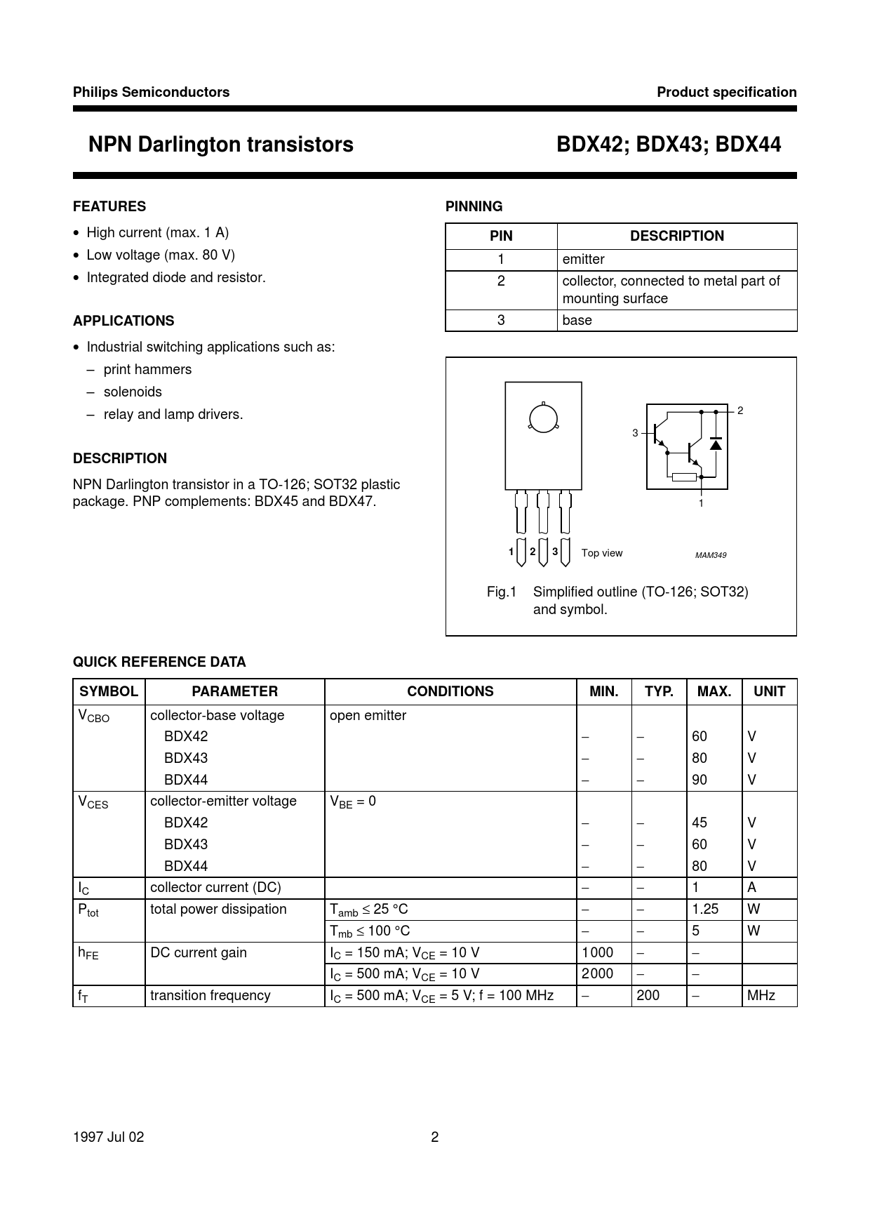 Philips Semiconductors. Product specification. NPN Darlington transistors. BDX42; BDX43; BDX44. FEATURES. PINNING. PIN. DESCRIPTION