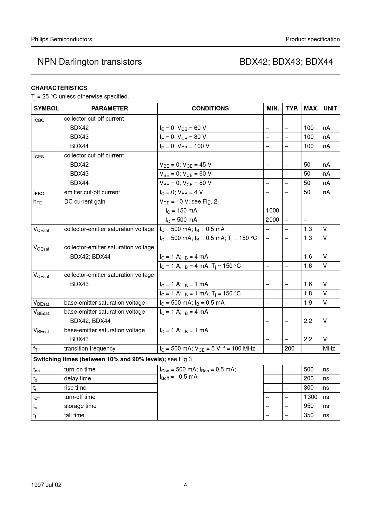 ICBO collector cut-off current BDX42 IE = 0; VCB = 60 V − − 100 nA BDX43 IE = 0; VCB = 80 V − − 100 nA BDX44 IE = 0; VCB = 100 V − − 100 nA ICES collector cut-off current BDX42 VBE = 0; VCE = 45 V − − 50 nA BDX43 VBE = 0; VCE = 60 V − − 50 nA BDX44 VBE = 0; VCE = 80 V − − 50 nA IEBO emitter cut-off current IC = 0; VEB = 4 V − − 50 nA hFE DC current gain VCE = 10 V; see Fig. 2 IC = 150 mA 1000 − − IC = 500 mA 2000 − − VCEsat collector-emitter saturation voltage IC = 500 mA; IB = 0.5 mA − − 1.3 V IC = 500 mA; IB = 0.5 mA; Tj = 150 °C − − 1.3 V VCEsat collector-emitter saturation voltage BDX42; BDX44 IC = 1 A; IB = 4 mA − − 1.6 V IC = 1 A; IB = 4 mA; Tj = 150 °C − − 1.6 V VCEsat collector-emitter saturation voltage BDX43 IC = 1 A; IB = 1 mA − − 1.6 V IC = 1 A; IB = 1 mA; Tj = 150 °C − − 1.8 V VBEsat base-emitter saturation voltage IC = 500 mA; IB = 0.5 mA − − 1.9 V VBEsat base-emitter saturation voltage IC = 1 A; IB = 4 mA BDX42; BDX44 − − 2.2 V VBEsat base-emitter saturation voltage IC = 1 A; IB = 1 mA BDX43 − − 2.2 V fT transition frequency IC = 500 mA; VCE = 5 V; f = 100 MHz − 200 − MHz