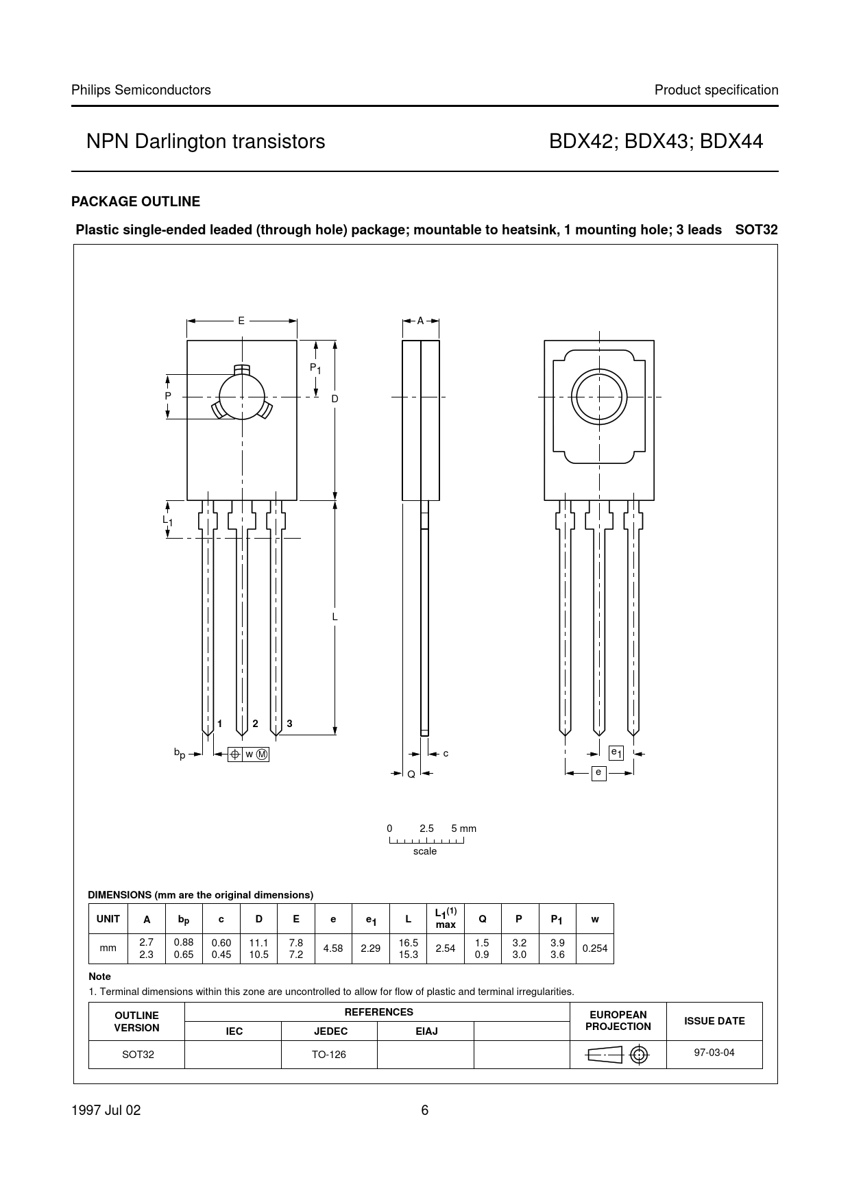 Philips Semiconductors Product specification NPN Darlington transistors BDX42; BDX43; BDX44 PACKAGE OUTLINEPlastic single-ended leaded (through hole) package; mountable to heatsink, 1 mounting hole; 3 leadsSOT32 E A P1 P D L1 L 123 b e w M c p 1 Q e 0 2.5 5 mm scale DIMENSIONS (mm are the original dimensions)LUNITAb1(1)pcDEee1LQPPw1max 2.7 0.88 0.60 11.1 7.8 16.5 1.5 3.2 3.9 mm 4.58 2.29 2.54 0.254 2.3 0.65 0.45 10.5 7.2 15.3 0.9 3.0 3.6 Note 1. Terminal dimensions within this zone are uncontrolled to allow for flow of plastic and terminal irregularities. REFERENCESOUTLINEEUROPEANISSUE DATEVERSIONPROJECTIONIECJEDECEIAJ SOT32 TO-126 97-03-04 1997 Jul 02 6 Document Outline FEATURES APPLICATIONS DESCRIPTION PINNING QUICK REFERENCE DATA LIMITING VALUES THERMAL CHARACTERISTICS CHARACTERISTICS PACKAGE OUTLINE SOT32 DEFINITIONS