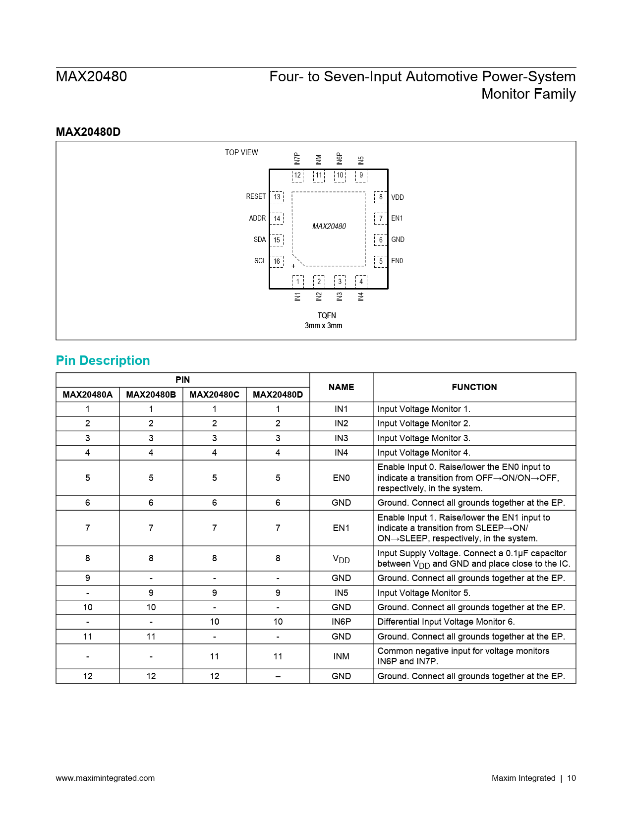 | Pages / Page | 41 / 10 — MAX20480D. Pin Description. PIN. NAME. FUNCTION. MAX20480A. MAX20480B. … |