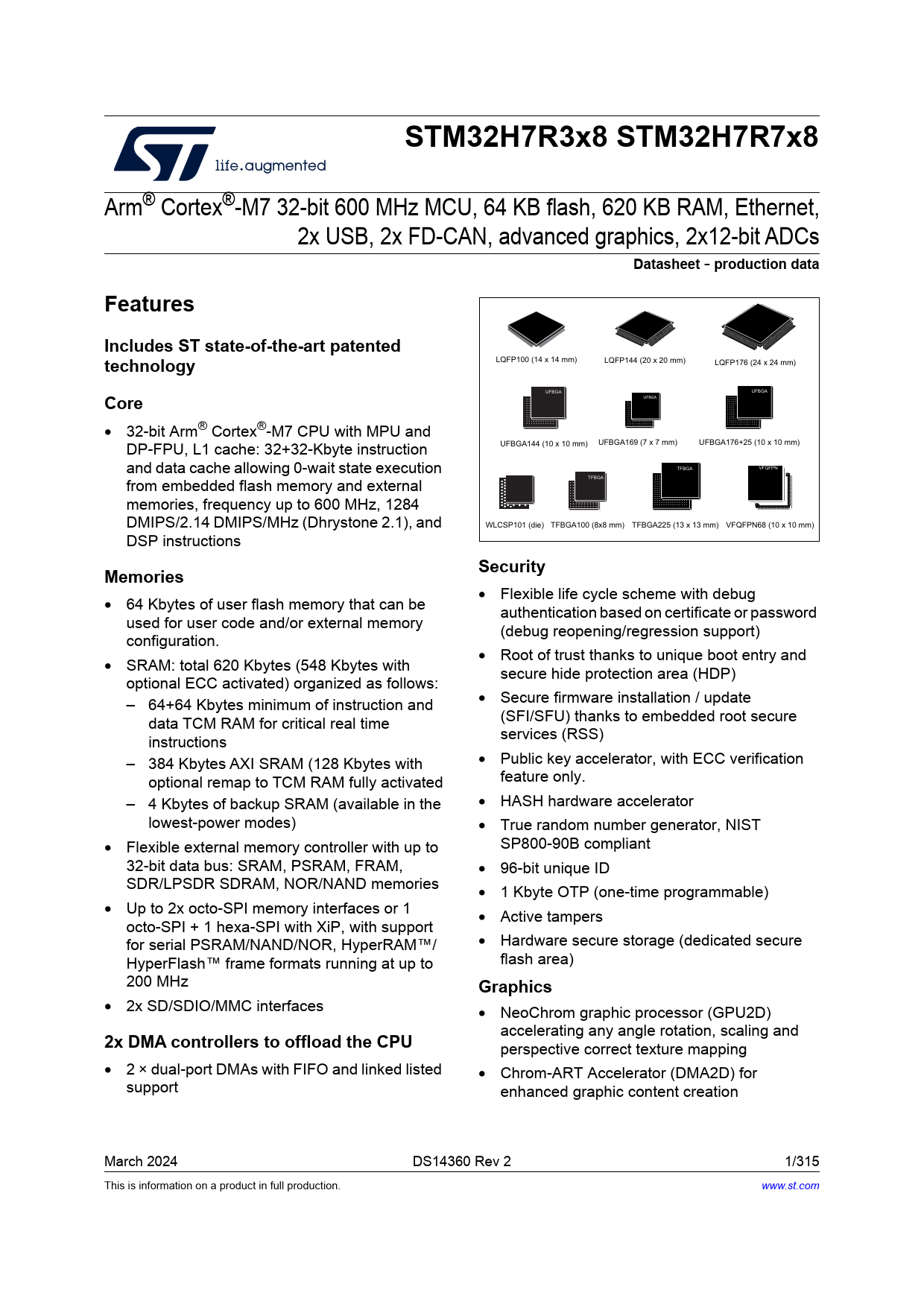 | Pages / Page | 315 / 1 — STM32H7R3x8 STM32H7R7x8. Datasheet. production data. Features. Includes … |
