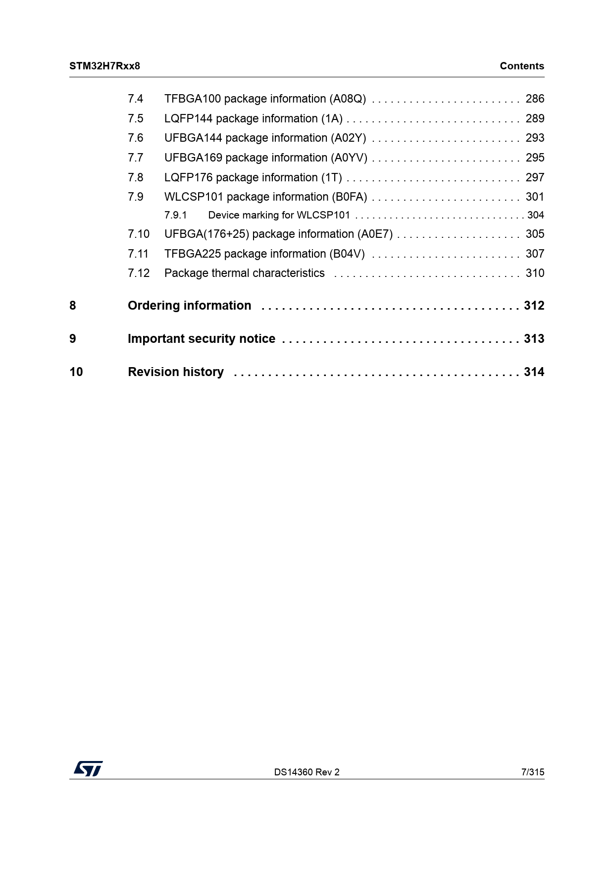 | Pages / Page | 315 / 7 — STM32H7Rxx8. Contents. Ordering information . 312. Important security … |