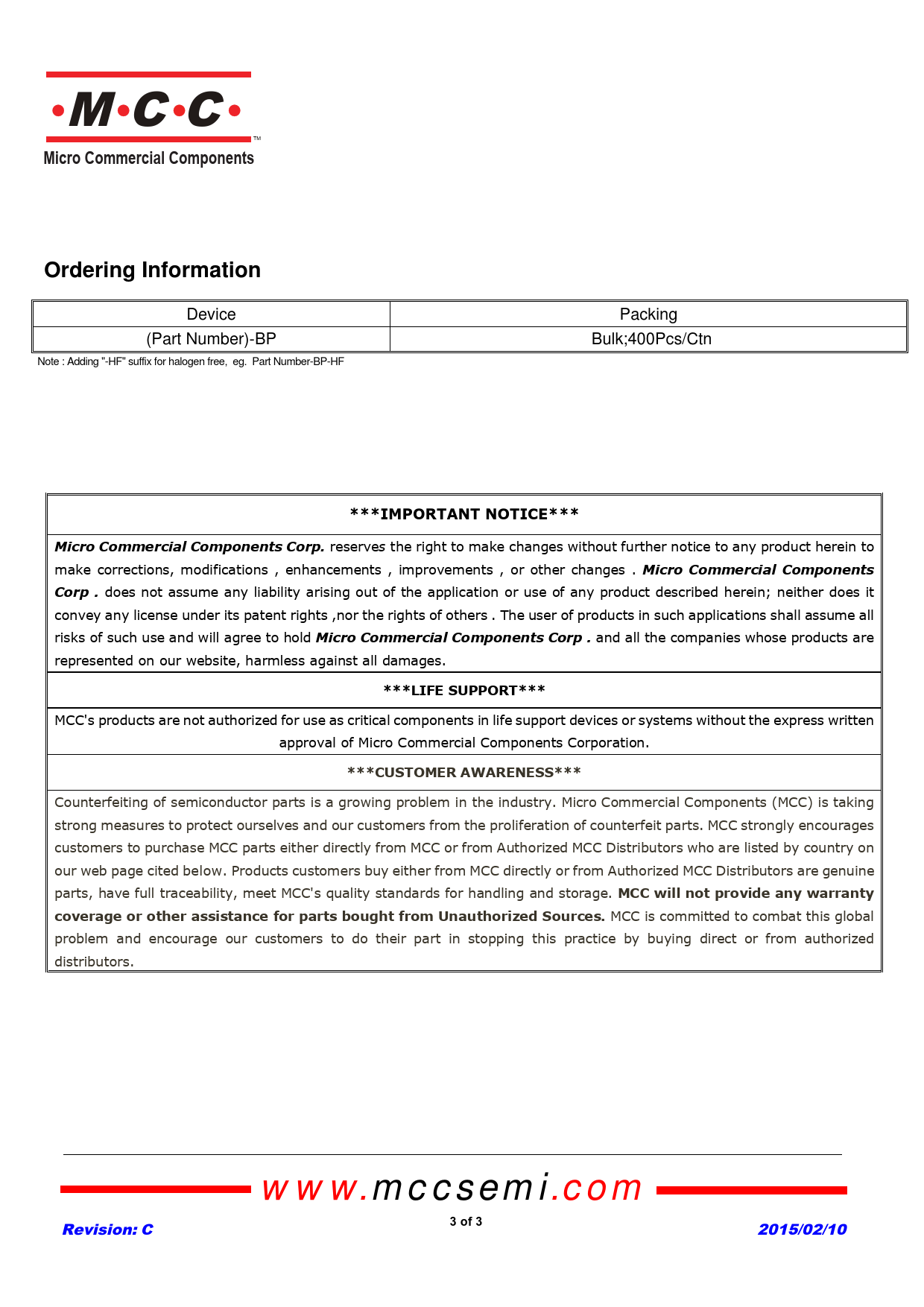 M C C TM Micro Commercial ComponentsOrdering Information Device Packing (Part Number)-BP Bulk;400Pcs/Ctn Note : Adding "-HF" suffix for halogen free, eg. Part Number-BP-HF ***IMPORTANT NOTICE***Micro Commercial Components Corp. reserves the right to make changes without further notice to any product herein to make corrections, modifications , enhancements , improvements , or other changes . Micro Commercial ComponentsCorp . does not assume any liability arising out of the application or use of any product described herein; neither does it convey any license under its patent rights ,nor the rights of others . The user of products in such applications shall assume all risks of such use and will agree to hold Micro Commercial Components Corp . and all the companies whose products are represented on our website, harmless against all damages. ***LIFE SUPPORT*** MCC's products are not authorized for use as critical components in life support devices or systems without the express written approval of Micro Commercial Components Corporation. ***CUSTOMERAWARENESS*** Counterfeiting of semiconductor parts is a growing problem i n the industry. Micro Commercial Components (MCC) is taking strong measures to protect ourselves and our customers from the proliferation of counterfeit parts. MCC strongly encourages customers to purchase MCC parts either directly from MCC or from Authorized MCC Distributors who are listed by country on our web page cited below. Products customers buy either fro m MCC directly or from Authorized MCC Distributors are genuine parts, have full traceability, meet MCC's quality standards for handling and storage. MCC will not provide any warranty coverage or other assistance for parts bought from Unauthorized Sources. MCC is committed to combat this global problem and encourage our customers to do their part in stopping this practice by buying direct or from authorized distributors. www.mccsemi.com 3 of 3 Revision: C 201 5/02/10