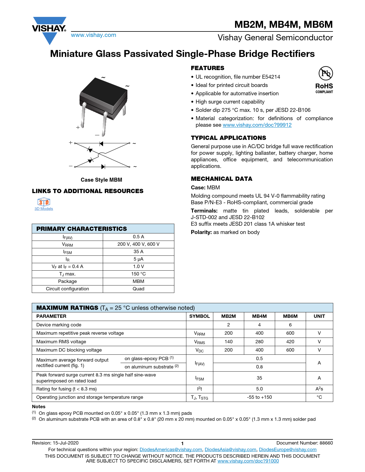 MB2M, MB4M, MB6M www.vishay.com Vishay General Semiconductor Miniature Glass Passivated Single-Phase Bridge RectifiersFEATURES • UL recognition, file number E54214 ~ • Ideal for printed circuit boards ~ • Applicable for automative insertion • High surge current capability • Solder dip 275 °C max. 10 s, per JESD 22-B106 • Material categorization: for definitions of compliance please see www.vishay.com/doc?99912 TYPICAL APPLICATIONS ~ General purpose use in AC/DC bridge full wave rectification for power supply, lighting ballaster, battery charger, home appliances, office equipment, and telecommunication ~ applications. Case Style MBMMECHANICAL DATALINKS TO ADDITIONAL RESOURCESCase: MBM Molding compound meets UL 94 V-0 flammability rating D 33 Base P/N-E3 - RoHS-compliant, commercial grade D 3D Models Terminals: matte tin plated leads, solderable per J-STD-002 and JESD 22-B102 E3 suffix meets JESD 201 class 1A whisker test PRIMARY CHARACTERISTICSPolarity: as marked on body IF(AV) 0.5 A VRRM 200 V, 400 V, 600 V IFSM 35 A IR 5 μA VF at IF = 0.4 A 1.0 V TJ max. 150 °C Package MBM Circuit configuration Quad MAXIMUM RATINGS (TA = 25 °C unless otherwise noted) PARAMETERSYMBOL MB2MMB4MMB6MUNIT Device marking code 2 4 6 Maximum repetitive peak reverse voltage VRRM 200 400 600 V Maximum RMS voltage VRMS 140 280 420 V Maximum DC blocking voltage VDC 200 400 600 V Maximum average forward output on glass-epoxy PCB (1) 0.5 I A rectified current (fig. 1) F(AV) on aluminum substrate (2) 0.8 Peak forward surge current 8.3 ms single half sine-wave I superimposed on rated load FSM 35 A Rating for fusing (t < 8.3 ms) I2t 5.0 A2s Operating junction and storage temperature range TJ, TSTG -55 to +150 °C Notes (1) On glass epoxy PCB mounted on 0.05" x 0.05" (1.3 mm x 1.3 mm) pads (2) On aluminum substrate PCB with an area of 0.8" x 0.8" (20 mm x 20 mm) mounted on 0.05" x 0.05" (1.3 mm x 1.3 mm) solder pad Revision: 15-Jul-2020 1 Document Number: 88660 For technical questions within your region: DiodesAmericas@vishay.com, DiodesAsia@vishay.com, DiodesEurope@vishay.com THIS DOCUMENT IS SUBJECT TO CHANGE WITHOUT NOTICE. THE PRODUCTS DESCRIBED HEREIN AND THIS DOCUMENT ARE SUBJECT TO SPECIFIC DISCLAIMERS, SET FORTH AT www.vishay.com/doc?91000