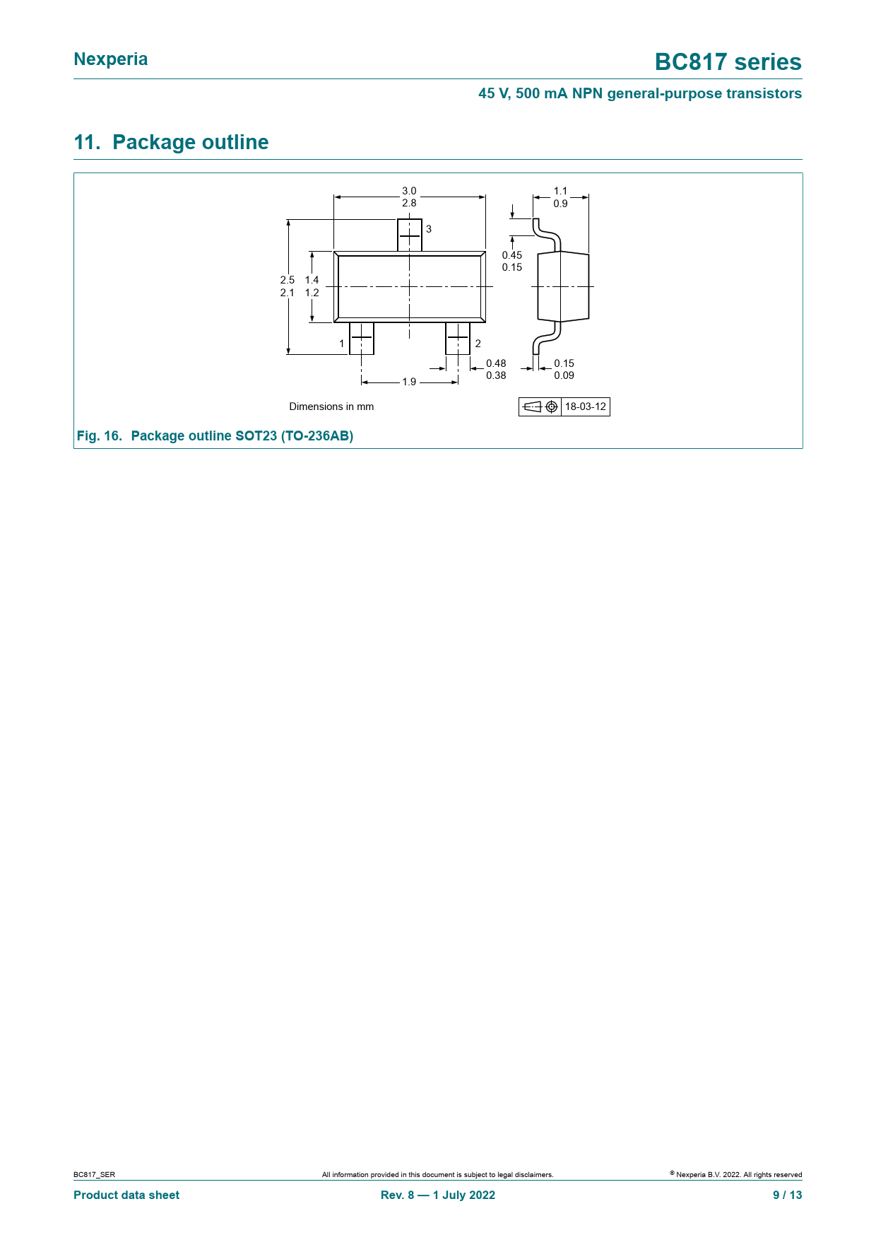 Nexperia. BC817 series. 45 V, 500 mA NPN general-purpose transistors. 11. Package outline