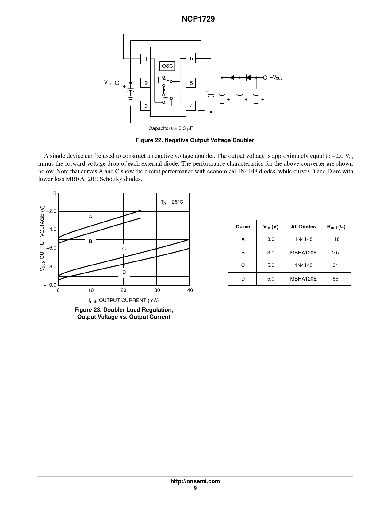 NCP1729. Figure 22. Negative Output Voltage Doubler. Curve. in (V). All Diodes. out (. Figure 23. Doubler Load Regulation,