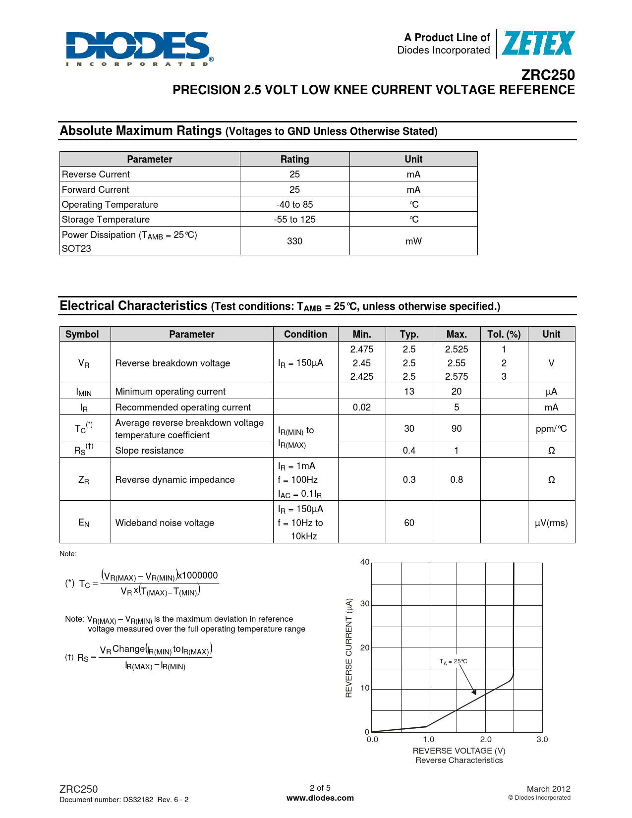 ZRC250 PRECISION 2.5 VOLT LOW KNEE CURRENT VOLTAGE REFERENCE Absolute Maximum Ratings (Voltages to GND Unless Otherwise Stated) Parameter Rating Unit