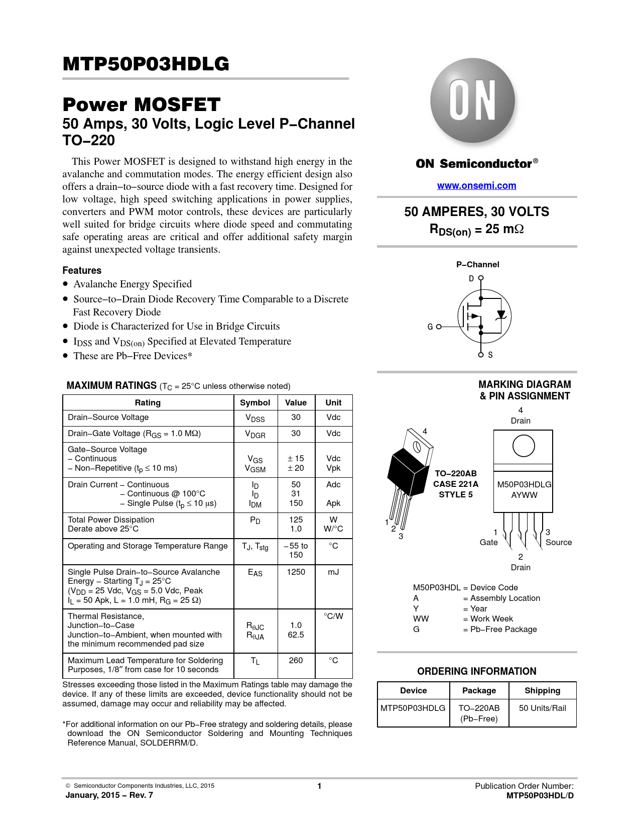 assumed, damage may occur and reliability may be affected. MTP50P03HDLG TO−220AB 50 Units/Rail (Pb−Free) *For additional information on our Pb−Free strategy and soldering details, please download the ON Semiconductor Soldering and Mounting Techniques Reference Manual, SOLDERRM/D. © Semiconductor Components Industries, LLC, 2015