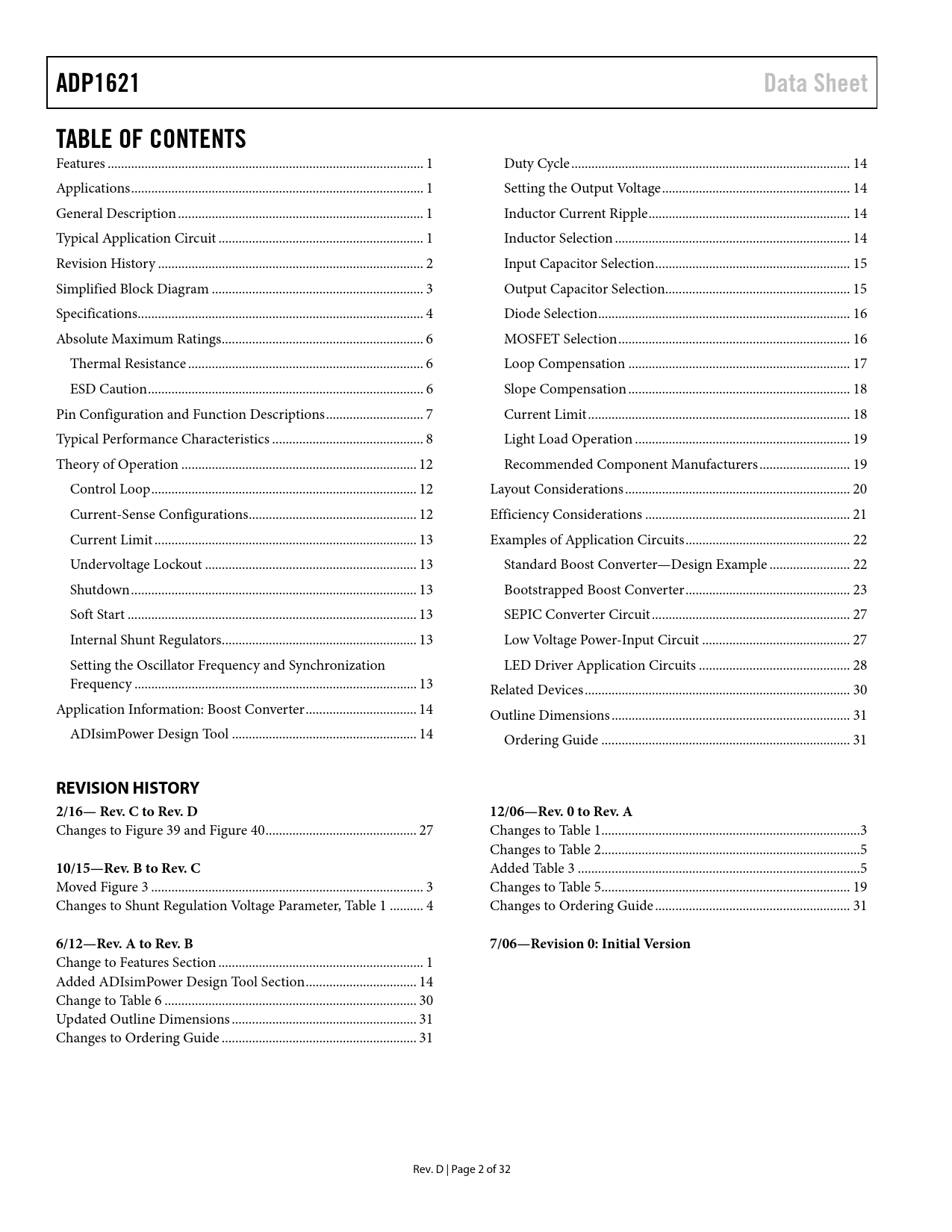 Pages / Page32 / 2 — ADP1621. Data Sheet. TABLE OF CONTENTS. REVISION HISTORY 2/16— Rev. C to …