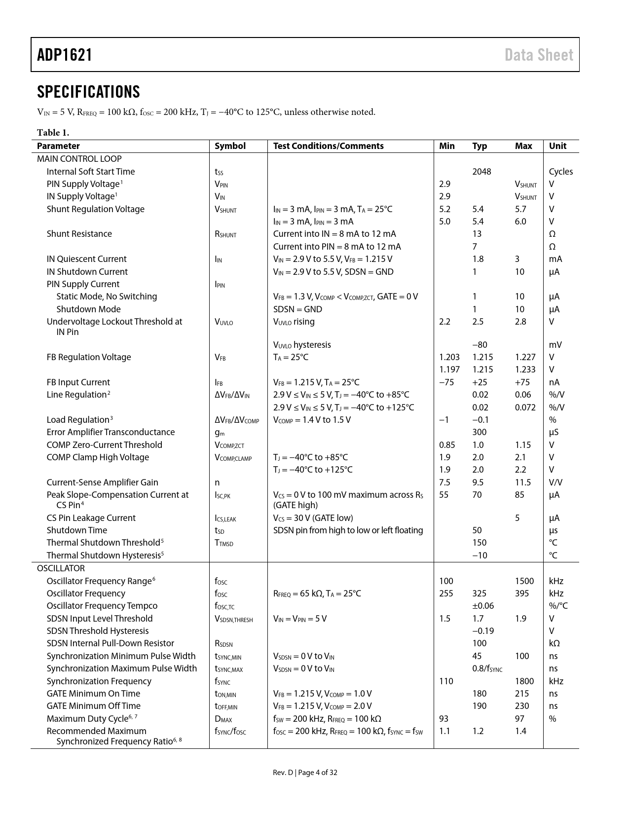 Pages / Page32 / 4 — ADP1621. Data Sheet. SPECIFICATIONS. Table 1. Parameter. Symbol. Test …
