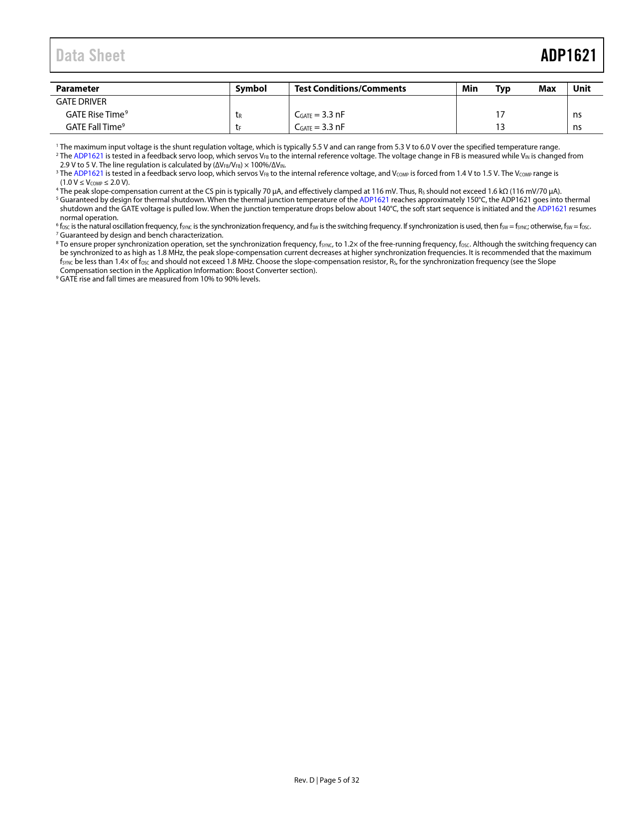 link to page 18 link to page 18 link to page 14 Data SheetADP1621ParameterSymbolTest Conditions/CommentsMinTypMaxUnit GATE DRIVER GATE Rise Time9 tR CGATE = 3.3 nF 17 ns GATE Fall Time9 tF CGATE = 3.3 nF 13 ns 1 The maximum input voltage is the shunt regulation voltage, which is typically 5.5 V and can range from 5.3 V to 6.0 V over the specified temperature range. 2 The ADP1621 is tested in a feedback servo loop, which servos VFB to the internal reference voltage. The voltage change in FB is measured while VIN is changed from 2.9 V to 5 V. The line regulation is calculated by (∆VFB/VFB) × 100%/∆VIN. 3 The ADP1621 is tested in a feedback servo loop, which servos VFB to the internal reference voltage, and VCOMP is forced from 1.4 V to 1.5 V. The VCOMP range is (1.0 V ≤ VCOMP ≤ 2.0 V). 4 The peak slope-compensation current at the CS pin is typically 70 µA, and effectively clamped at 116 mV. Thus, RS should not exceed 1.6 kΩ (116 mV/70 µA). 5 Guaranteed by design for thermal shutdown. When the thermal junction temperature of the ADP1621 reaches approximately 150°C, the ADP1621 goes into thermal shutdown and the GATE voltage is pulled low. When the junction temperature drops below about 140°C, the soft start sequence is initiated and the ADP1621 resumes normal operation. 6 fOSC is the natural oscil ation frequency, fSYNC is the synchronization frequency, and fSW is the switching frequency. If synchronization is used, then fSW = fSYNC; otherwise, fSW = fOSC. 7 Guaranteed by design and bench characterization. 8 To ensure proper synchronization operation, set the synchronization frequency, fSYNC, to 1.2× of the free-running frequency, fOSC. Although the switching frequency can be synchronized to as high as 1.8 MHz, the peak slope-compensation current decreases at higher synchronization frequencies. It is recommended that the maximum fSYNC be less than 1.4× of fOSC and should not exceed 1.8 MHz. Choose the slope-compensation resistor, RS, for the synchronization frequency (see the Slope Compensation section in the Application Information: Boost Converter section). 9 GATE rise and fall times are measured from 10% to 90% levels. Rev. D | Page 5 of 32 Document Outline FEATURES APPLICATIONS GENERAL DESCRIPTION TYPICAL APPLICATION CIRCUIT TABLE OF CONTENTS REVISION HISTORY SIMPLIFIED BLOCK DIAGRAM SPECIFICATIONS ABSOLUTE MAXIMUM RATINGS THERMAL RESISTANCE ESD CAUTION PIN CONFIGURATION AND FUNCTION DESCRIPTIONS TYPICAL PERFORMANCE CHARACTERISTICS THEORY OF OPERATION CONTROL LOOP CURRENT-SENSE CONFIGURATIONS CURRENT LIMIT UNDERVOLTAGE LOCKOUT SHUTDOWN SOFT START INTERNAL SHUNT REGULATORS SETTING THE OSCILLATOR FREQUENCY AND SYNCHRONIZATION FREQUENCY APPLICATION INFORMATION: BOOST CONVERTER ADIsimPower DESIGN TOOL DUTY CYCLE SETTING THE OUTPUT VOLTAGE INDUCTOR CURRENT RIPPLE INDUCTOR SELECTION INPUT CAPACITOR SELECTION OUTPUT CAPACITOR SELECTION DIODE SELECTION MOSFET SELECTION LOOP COMPENSATION SLOPE COMPENSATION CURRENT LIMIT LIGHT LOAD OPERATION Discontinuous Conduction Mode Pulse-Skipping Modulation RECOMMENDED COMPONENT MANUFACTURERS LAYOUT CONSIDERATIONS EFFICIENCY CONSIDERATIONS EXAMPLES OF APPLICATION CIRCUITS STANDARD BOOST CONVERTER—DESIGN EXAMPLE BOOTSTRAPPED BOOST CONVERTER Low Input and High Output Boost Converter High Input Voltage Boost Converter Circuit SEPIC CONVERTER CIRCUIT LOW VOLTAGE POWER-INPUT CIRCUIT LED DRIVER APPLICATION CIRCUITS RELATED DEVICES OUTLINE DIMENSIONS ORDERING GUIDE