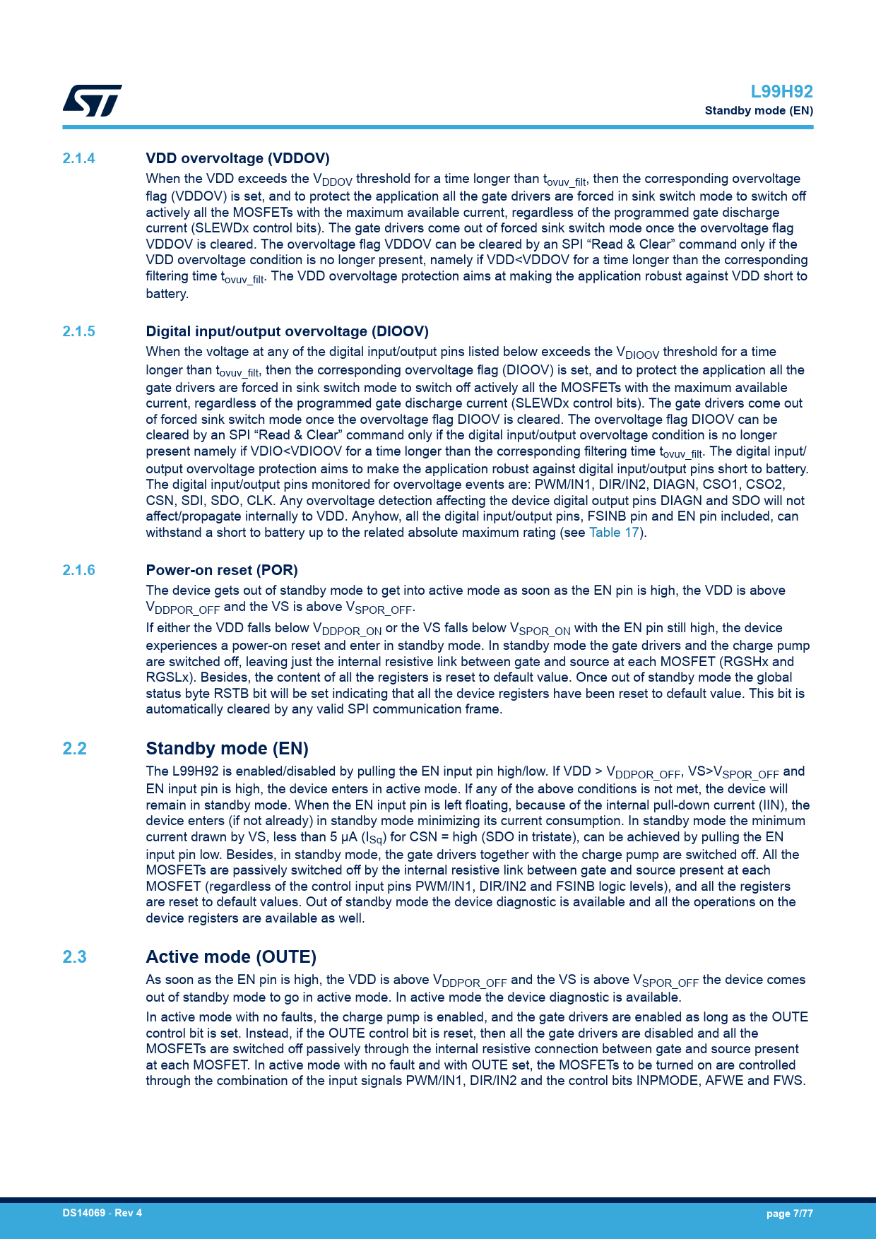 link to page 27 L99H92Standby mode (EN)2.1.4VDD overvoltage (VDDOV) When the VDD exceeds the VDDOV threshold for a time longer than tovuv_filt, then the corresponding overvoltage flag (VDDOV) is set, and to protect the application all the gate drivers are forced in sink switch mode to switch off actively all the MOSFETs with the maximum available current, regardless of the programmed gate discharge current (SLEWDx control bits). The gate drivers come out of forced sink switch mode once the overvoltage flag VDDOV is cleared. The overvoltage flag VDDOV can be cleared by an SPI “Read & Clear” command only if the VDD overvoltage condition is no longer present, namely if VDD<VDDOV for a time longer than the corresponding filtering time tovuv_filt. The VDD overvoltage protection aims at making the application robust against VDD short to battery. 2.1.5Digital input/output overvoltage (DIOOV) When the voltage at any of the digital input/output pins listed below exceeds the VDIOOV threshold for a time longer than tovuv_filt, then the corresponding overvoltage flag (DIOOV) is set, and to protect the application all the gate drivers are forced in sink switch mode to switch off actively all the MOSFETs with the maximum available current, regardless of the programmed gate discharge current (SLEWDx control bits). The gate drivers come out of forced sink switch mode once the overvoltage flag DIOOV is cleared. The overvoltage flag DIOOV can be cleared by an SPI “Read & Clear” command only if the digital input/output overvoltage condition is no longer present namely if VDIO<VDIOOV for a time longer than the corresponding filtering time tovuv_filt. The digital input/ output overvoltage protection aims to make the application robust against digital input/output pins short to battery. The digital input/output pins monitored for overvoltage events are: PWM/IN1, DIR/IN2, DIAGN, CSO1, CSO2, CSN, SDI, SDO, CLK. Any overvoltage detection affecting the device digital output pins DIAGN and SDO will not affect/propagate internally to VDD. Anyhow, all the digital input/output pins, FSINB pin and EN pin included, can withstand a short to battery up to the related absolute maximum rating (see Table 17). 2.1.6Power-on reset (POR) The device gets out of standby mode to get into active mode as soon as the EN pin is high, the VDD is above VDDPOR_OFF and the VS is above VSPOR_OFF. If either the VDD falls below VDDPOR_ON or the VS falls below VSPOR_ON with the EN pin still high, the device experiences a power-on reset and enter in standby mode. In standby mode the gate drivers and the charge pump are switched off, leaving just the internal resistive link between gate and source at each MOSFET (RGSHx and RGSLx). Besides, the content of all the registers is reset to default value. Once out of standby mode the global status byte RSTB bit will be set indicating that all the device registers have been reset to default value. This bit is automatically cleared by any valid SPI communication frame. 2.2Standby mode (EN) The L99H92 is enabled/disabled by pulling the EN input pin high/low. If VDD > VDDPOR_OFF, VS>VSPOR_OFF and EN input pin is high, the device enters in active mode. If any of the above conditions is not met, the device will remain in standby mode. When the EN input pin is left floating, because of the internal pull-down current (IIN), the device enters (if not already) in standby mode minimizing its current consumption. In standby mode the minimum current drawn by VS, less than 5 μA (ISq) for CSN = high (SDO in tristate), can be achieved by pulling the EN input pin low. Besides, in standby mode, the gate drivers together with the charge pump are switched off. All the MOSFETs are passively switched off by the internal resistive link between gate and source present at each MOSFET (regardless of the control input pins PWM/IN1, DIR/IN2 and FSINB logic levels), and all the registers are reset to default values. Out of standby mode the device diagnostic is available and all the operations on the device registers are available as well. 2.3Active mode (OUTE) As soon as the EN pin is high, the VDD is above VDDPOR_OFF and the VS is above VSPOR_OFF the device comes out of standby mode to go in active mode. In active mode the device diagnostic is available. In active mode with no faults, the charge pump is enabled, and the gate drivers are enabled as long as the OUTE control bit is set. Instead, if the OUTE control bit is reset, then all the gate drivers are disabled and all the MOSFETs are switched off passively through the internal resistive connection between gate and source present at each MOSFET. In active mode with no fault and with OUTE set, the MOSFETs to be turned on are controlled through the combination of the input signals PWM/IN1, DIR/IN2 and the control bits INPMODE, AFWE and FWS. DS14069 - Rev 4page 7/77 Document Outline L99H92 Features Applications Description 1 Block diagram and pins description 1.1 Block diagram 1.2 Pinout 1.3 Pins description 2 Device description 2.1 Supply pins 2.1.1 VS overvoltage warning (VSOVW) 2.1.2 VDH overvoltage (VDHOV) 2.1.3 VDH undervoltage (VDHUV) 2.1.4 VDD overvoltage (VDDOV) 2.1.5 Digital input/output overvoltage (DIOOV) 2.1.6 Power-on reset (POR) 2.2 Standby mode (EN) 2.3 Active mode (OUTE) 2.4 Thermal warning and thermal shutdown (TW/TSD) 2.5 Charge pump (CPOUT) 2.6 Gate drivers 2.6.1 Outputs driving signals (PWM/IN1 and DIR/IN2) 2.6.2 Slew rate control (SLEW) 2.6.3 Short circuit detection / drain-source monitoring (DSHS/DSLS) 2.6.4 Programmable cross current protection time (DT) 2.7 Diagnostic in off-mode (O1DS/O2DS) 2.8 Fail-safe output switch-off input not pin (FSINB) 2.9 Diagnostic not output (DIAGN) 2.10 Current monitors 2.11 Window watchdog (WDG) 3 Application 4 Serial peripheral interface (SPI) 4.1 ST SPI 4.1 4.1.1 Physical layer 4.1.2 Clock and data characteristics 4.1.3 Communication protocol 4.1.4 Address definition 5 Electrical characteristics 5.1 Absolute maxi
