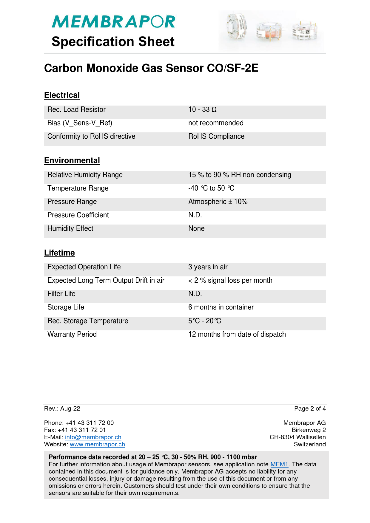 For further information about usage of Membrapor sensors, see application note MEM1. The data contained in this document is for guidance only. Membrapor AG accepts no liability for any consequential losses, injury or damage resulting from the use of this document or from any omissions or errors herein. Customers should test under their own conditions to ensure that the sensors are suitable for their own requirements.