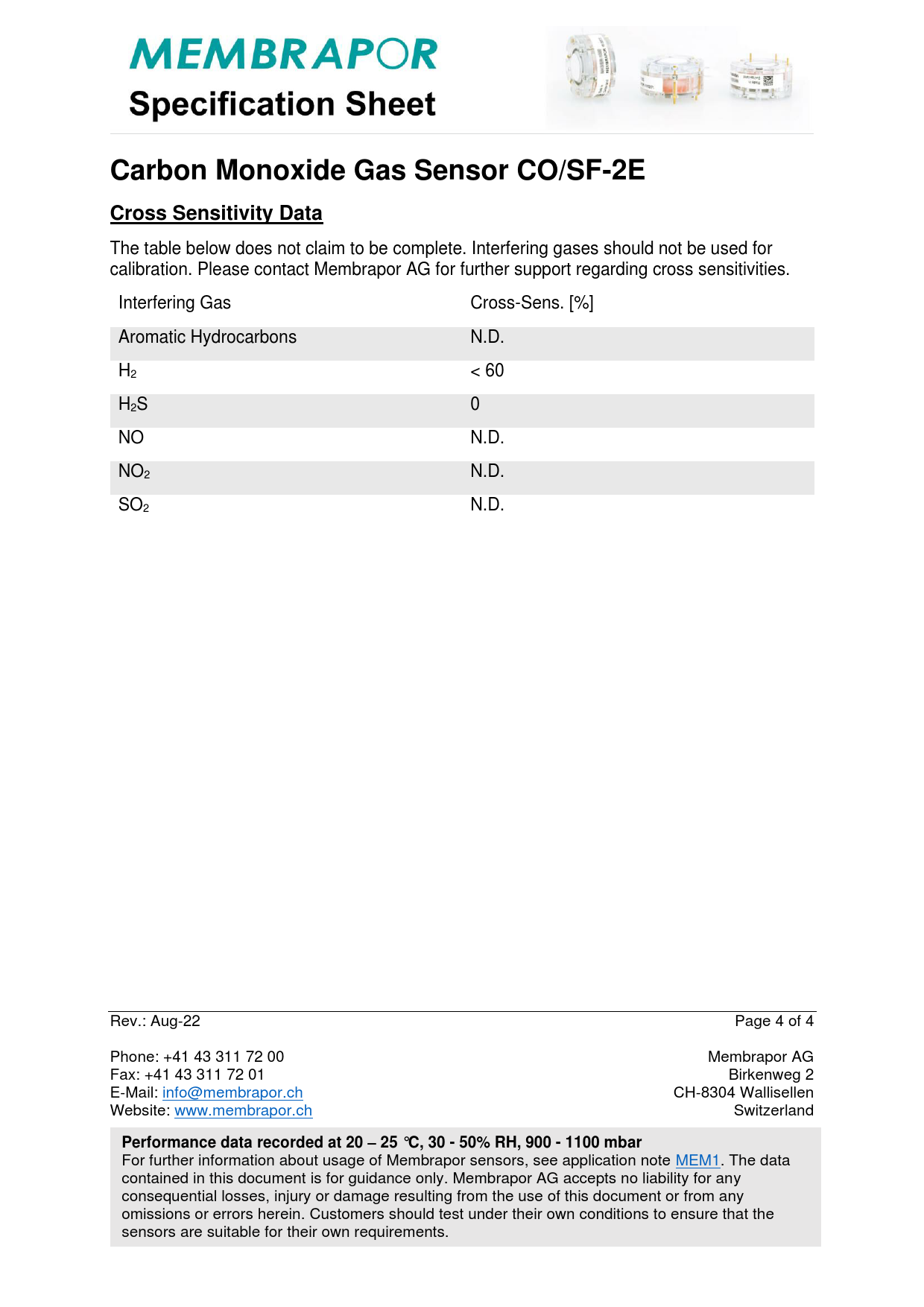The table below does not claim to be complete. Interfering gases should not be used for calibration. Please contact Membrapor AG for further support regarding cross sensitivities. Interfering Gas Cross-Sens. [%] Aromatic Hydrocarbons N.D. H2 < 60 H2S 0 NO N.D. NO2 N.D. SO2 N.D. Rev.: Aug-22 Page 4 of 4 Phone: +41 43 311 72 00 Membrapor AG Fax: +41 43 311 72 01 Birkenweg 2 E-Mail: info@membrapor.ch CH-8304 Wallisellen Website: www.membrapor.ch Switzerland
