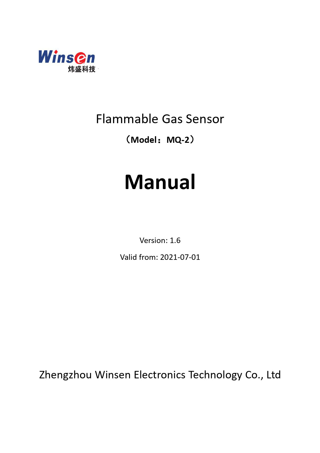 Version: 1.6 Valid from: 2021-07-01 Zhengzhou Winsen Electronics Technology Co., Ltd Document Outline Flammable Gas Sensor Instructions: The above fig is the basic test circ Resistance of Sensitive materials (Rs)=(Vc/VRL-1)× Power consumption of Sensitive materials (Ps)=Vc2×