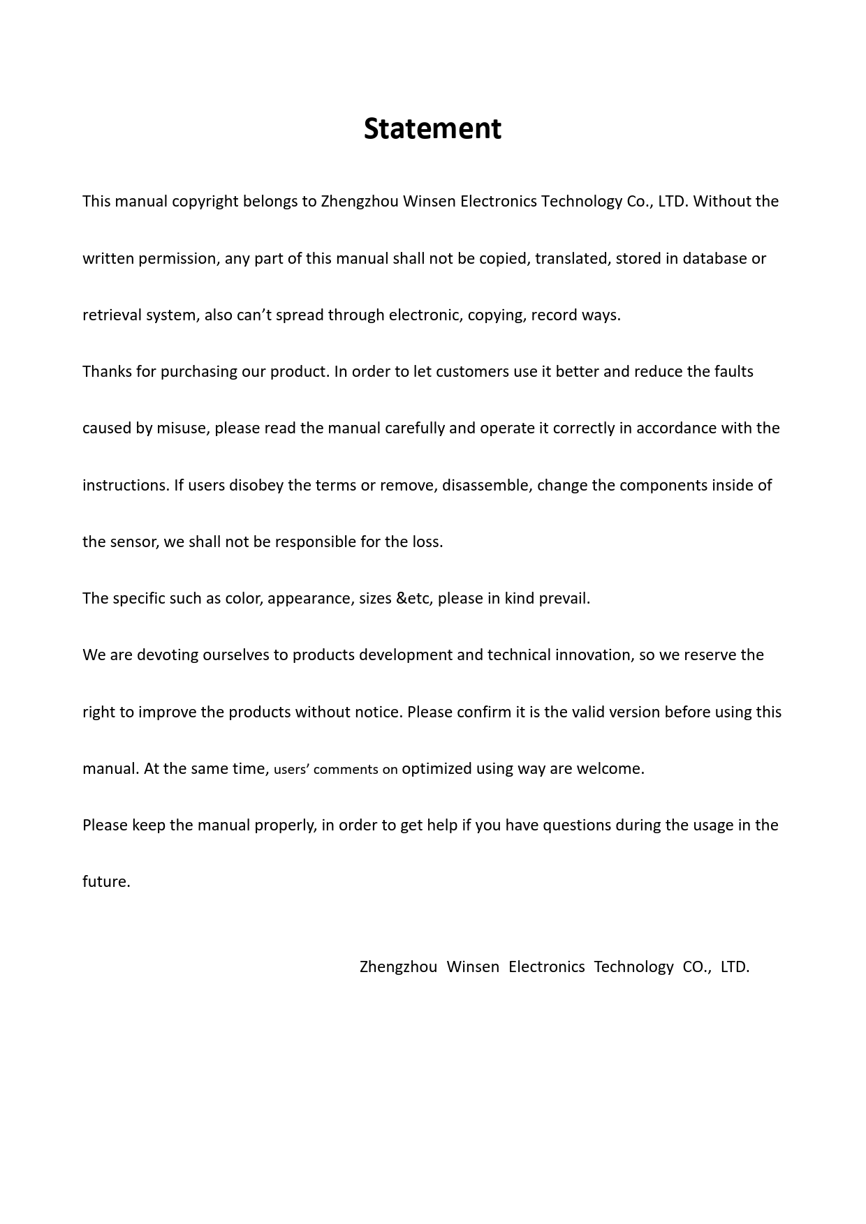 This manual copyright belongs to Zhengzhou Winsen Electronics Technology Co., LTD. Without the written permission, any part of this manual shal not be copied, translated, stored in database or retrieval system, also can’t spread through electronic, copying, record ways. Thanks for purchasing our product. In order to let customers use it better and reduce the faults caused by misuse, please read the manual careful y and operate it correctly in accordance with the instructions. If users disobey the terms or remove, disassemble, change the components inside of the sensor, we shal not be responsible for the loss. The specific such as color, appearance, sizes &etc, please in kind prevail. We are devoting ourselves to products development and technical innovation, so we reserve the right to improve the products without notice. Please confirm it is the valid version before using this manual. At the same time, users’ comments on optimized using way are welcome. Please keep the manual properly, in order to get help if you have questions during the usage in the future. Zhengzhou Winsen Electronics Technology CO., LTD. Document Outline Flammable Gas Sensor Instructions: The above fig is the basic test circ Resistance of Sensitive materials (Rs)=(Vc/VRL-1)× Power consumption of Sensitive materials (Ps)=Vc2×