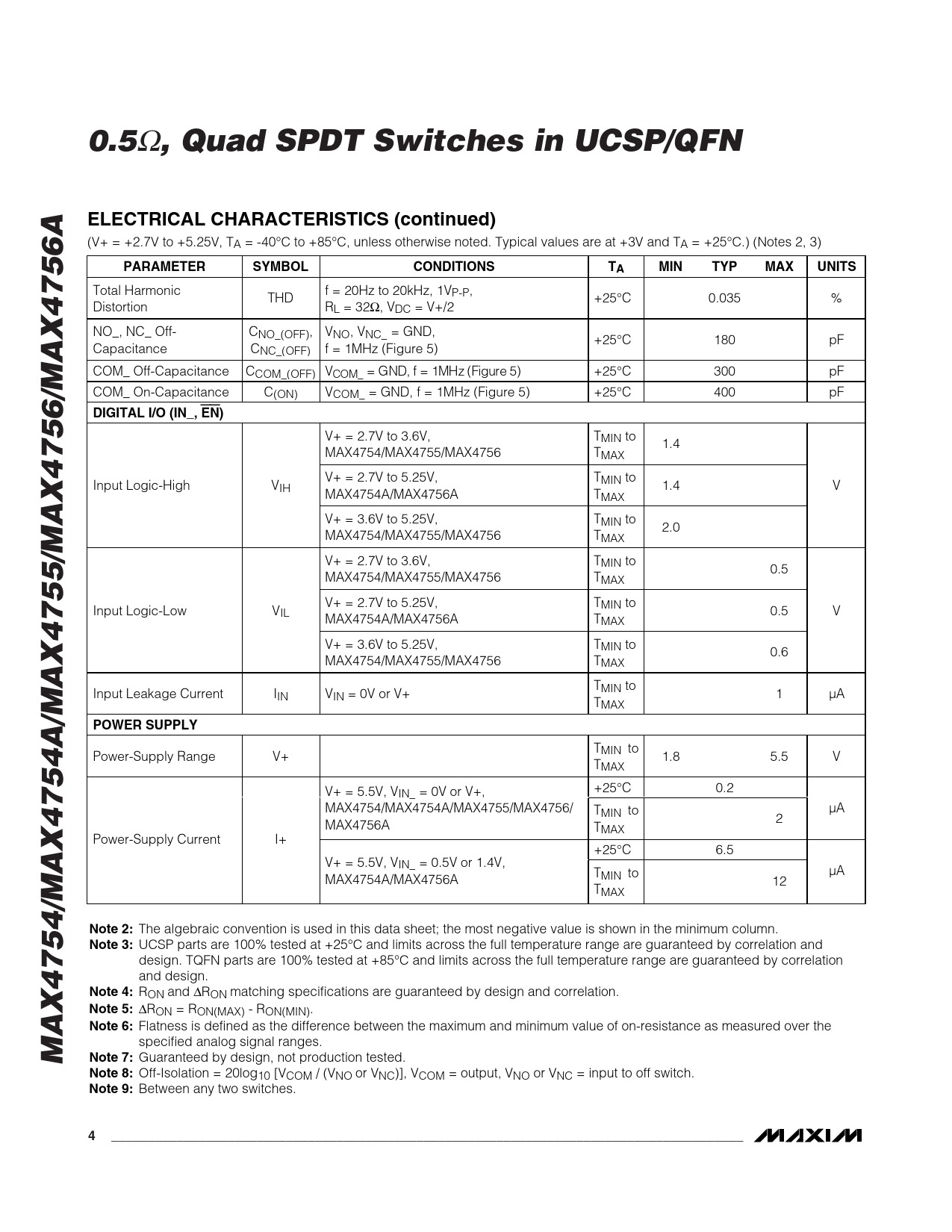 0.5 Ω , Quad SPDT Switches in UCSP/QFNELECTRICAL CHARACTERISTICS (continued) (V+ = +2.7V to +5.25V, TA = -40°C to +85°C, unless otherwise noted. Typical values are at +3V and TA = +25°C.) (Notes 2, 3) PARAMETERSYMBOLCONDITIONSTAMINTYPMAXUNITS Total Harmonic f = 20Hz to 20kHz, 1V THD P-P, +25°C 0.035 % Distortion RL = 32Ω, VDC = V+/2 NO_, NC_ Off- CNO_(OFF), VNO, VNC_ = GND, +25°C 180 pF Capacitance CNC_(OFF) f = 1MHz (Figure 5) COM_ Off-Capacitance CCOM_(OFF) V C OM _ = G N D , f = 1M H z ( Fi g ur e 5) +25°C 300 pF COM_ On-Capacitance C(ON) VCOM_ = GND, f = 1MHz (Figure 5) +25°C 400 pF DIGITAL I/O (IN_, EN ) V+ = 2.7V to 3.6V, TMIN to 1.4 MAX4754/MAX4755/MAX4756 TMAX V+ = 2.7V to 5.25V, TMIN to Input Logic-High VIH 1.4 V MAX4754A/MAX4756A TMAX V+ = 3.6V to 5.25V, TMIN to 2.0 MAX4754/MAX4755/MAX4756 TMAX V+ = 2.7V to 3.6V, TMIN to 0.5 MAX4754/MAX4755/MAX4756 TMAX V+ = 2.7V to 5.25V, TMIN to Input Logic-Low VIL 0.5 V MAX4754A/MAX4756A TMAX V+ = 3.6V to 5.25V, TMIN to 0.6 MAX4754/MAX4755/MAX4756 TMAX T Input Leakage Current I MIN to IN VIN = 0V or V+ 1 µA TMAX POWER SUPPLY T Power-Supply Range V+ MIN to 1.8 5.5 V TMAX +25°C 0.2 V+ = 5.5V, VIN_ = 0V or V+, MAX4754/MAX4754A/MAX4755/MAX4756/ TMIN to µA 2 MAX4756A TMAX Power-Supply Current I+ +25°C 6.5 V+ = 5.5V, VIN_ = 0.5V or 1.4V, T µA MAX4754A/MAX4756A MIN to 12 TMAX Note 2: The algebraic convention is used in this data sheet; the most negative value is shown in the minimum column. Note 3: UCSP parts are 100% tested at +25°C and limits across the full temperature range are guaranteed by correlation and design. TQFN parts are 100% tested at +85°C and limits across the full temperature range are guaranteed by correlation and design. Note 4: RON and ΔRON matching specifications are guaranteed by design and correlation. Note 5: ΔRON = RON(MAX) - RON(MIN). Note 6: Flatness is defined as the difference between the maximum and minimum value of on-resistance as measured over the specified analog signal ranges. MAX4754/MAX4754A/MAX4755/MAX4756/MAX4756ANote 7: Guaranteed by design, not production tested. Note 8: Off-Isolation = 20log10 [VCOM / (VNO or VNC)], VCOM = output, VNO or VNC = input to off switch. Note 9: Between any two switches. 4_______________________________________________________________________________________