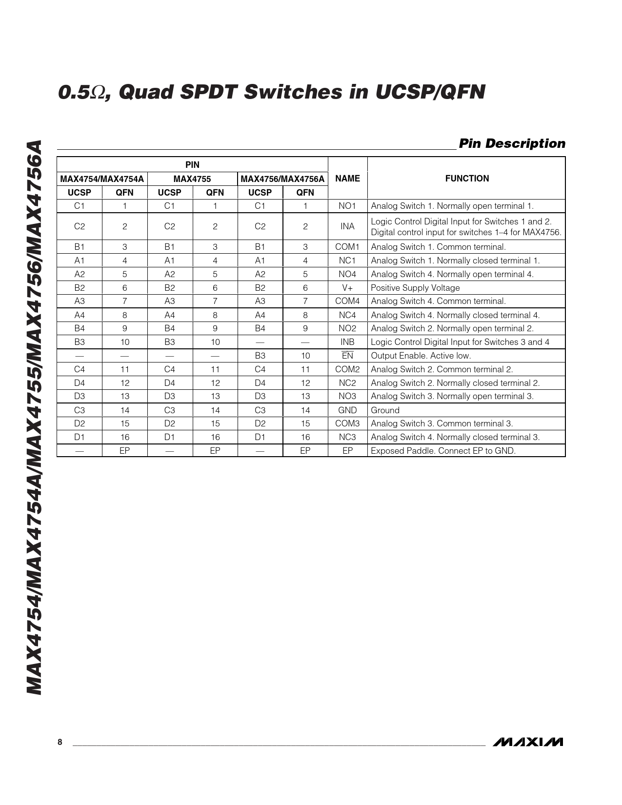 0.5. , Quad SPDT Switches in UCSP/QFN. Pin Description. PIN. MAX4754/MAX4754A. MAX4755. MAX4756/MAX4756A. NAME. FUNCTION. UCSP. QFN