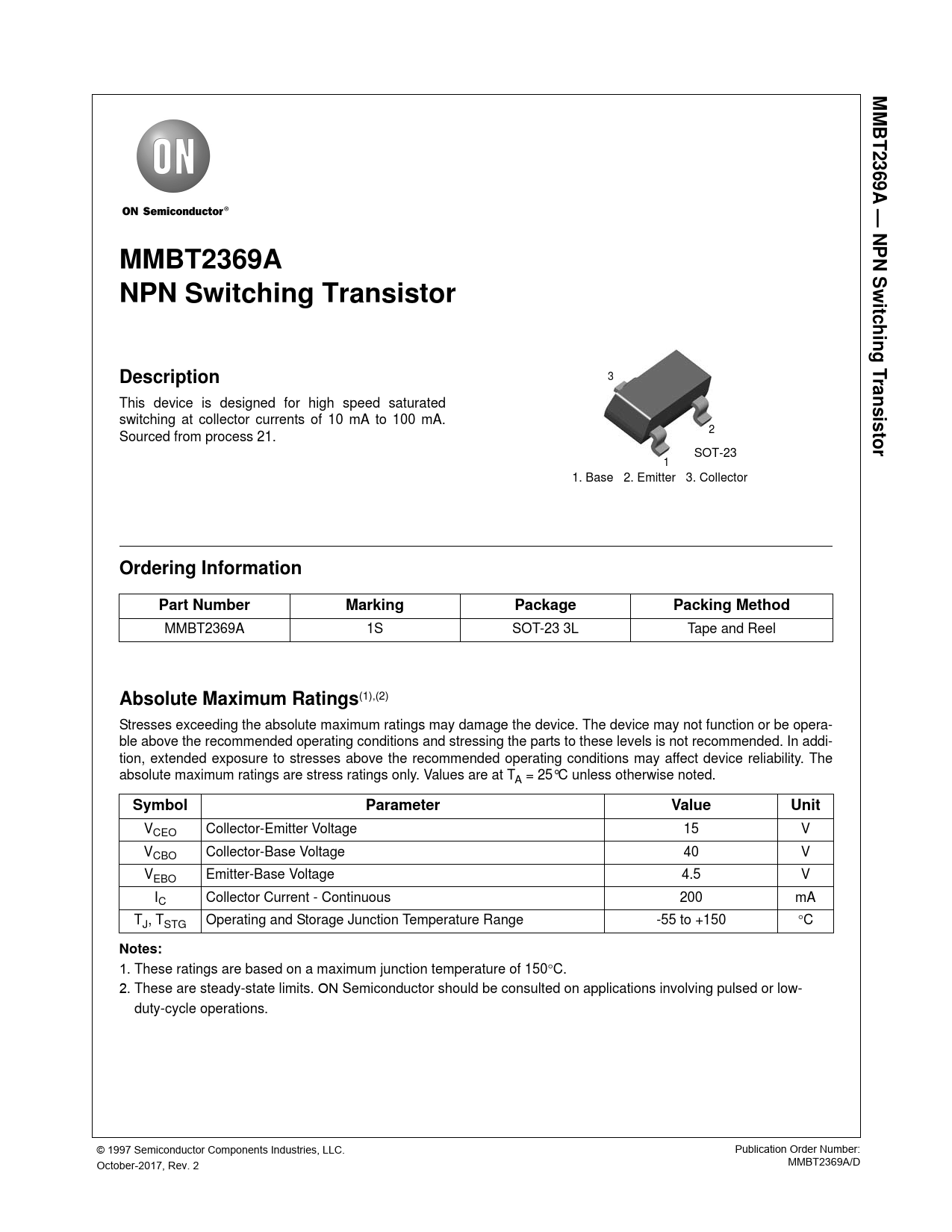 1. These ratings are based on a maximum junction temperature of 150°C. 2. These are steady-state limits. ON Semiconductor should be consulted on applications involving pulsed or low- duty-cycle operations. © 1997 Semiconductor Components Industries, LLC. Publication Order Number: MMBT2369A/D October-2017, Rev. 2