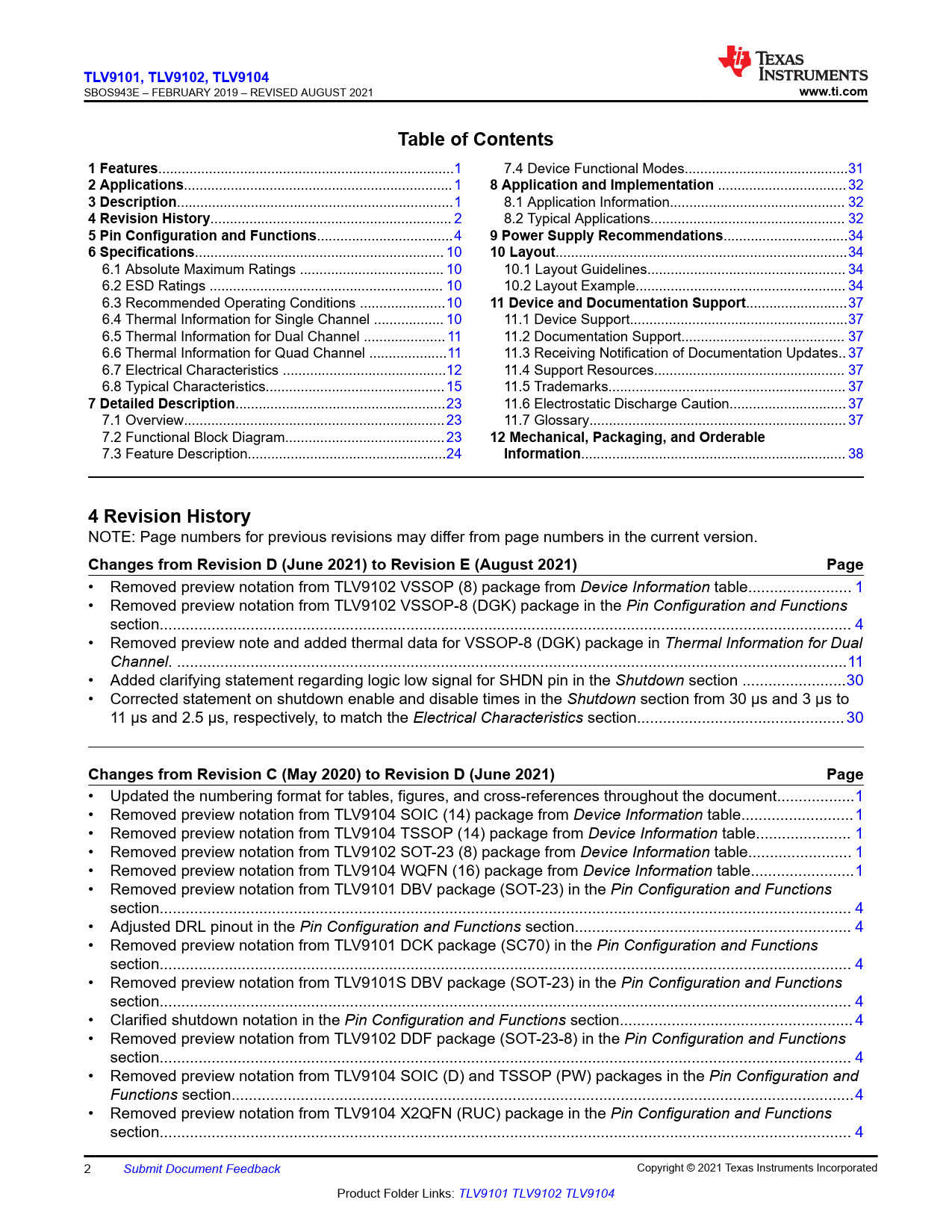 TLV9101, TL. V9102,. TLV9104. www.ti.com. Table of Contents. 1 Features. 2 Applications. 8 Application and Implementation