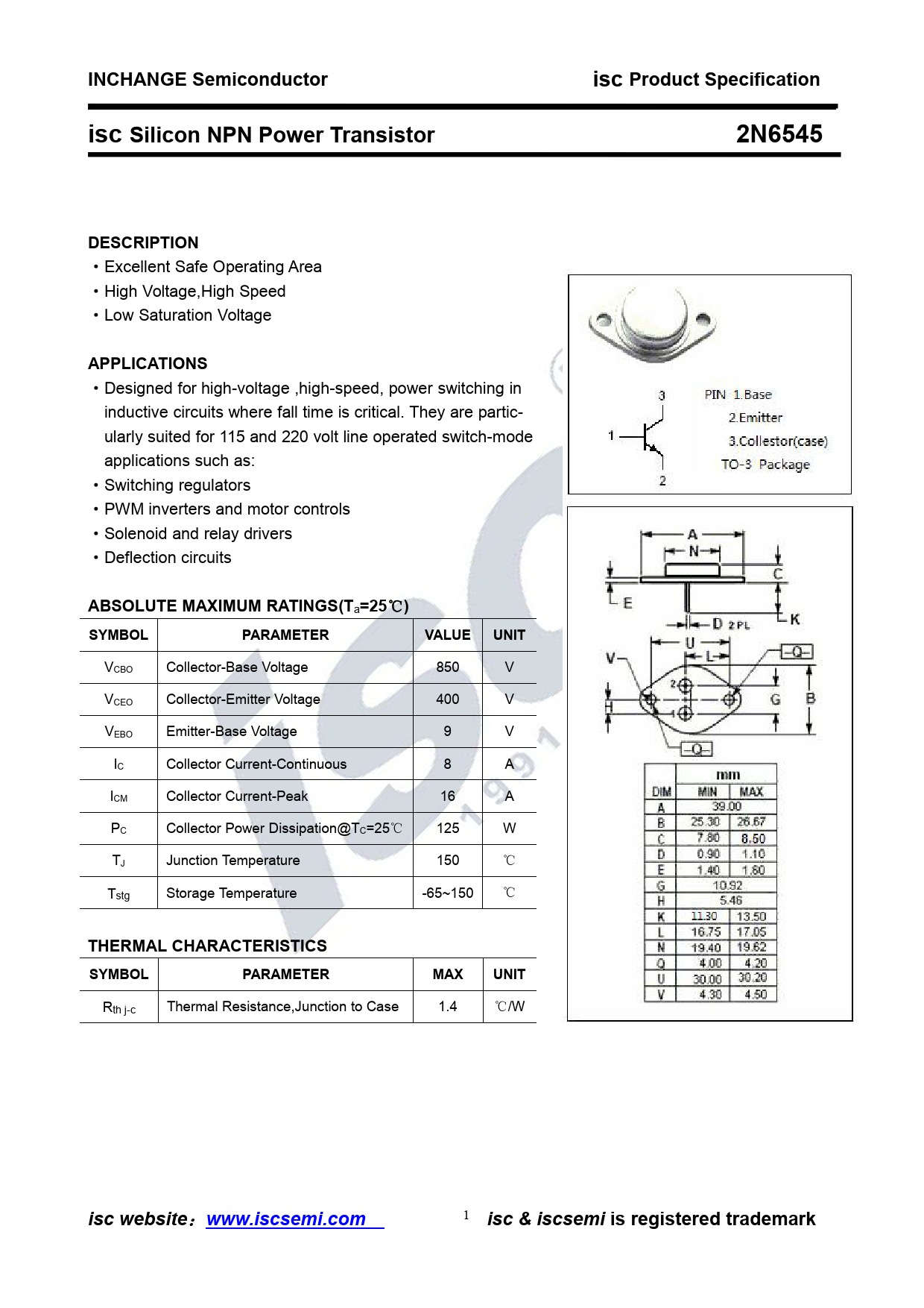 INCHANGE Semiconductorisc Product Specificationisc Silicon NPN Power Transistor2N6545DESCRIPTION ·Excel ent Safe Operating Area ·High Voltage,High Speed ·Low Saturation Voltage APPLICATIONS ·Designed for high-voltage ,high-speed, power switching in inductive circuits where fal time is critical. They are partic- ularly suited for 115 and 220 volt line operated switch-mode applications such as: ·Switching regulators ·PWM inverters and motor controls ·Solenoid and relay drivers ·Deflection circuits ABSOLUTE MAXIMUM RATINGS(T a =25 ℃ )SYMBOLPARAMETERVALUEUNIT VCBO Col ector-Base Voltage 850 V VCEO Col ector-Emitter Voltage 400 V VEBO Emitter-Base Voltage 9 V IC Col ector Current-Continuous 8 A ICM Col ector Current-Peak 16 A PC Col ector Power Dissipation@TC=25℃ 125 W TJ Junction Temperature 150 ℃ Tstg Storage Temperature -65~150 ℃ THERMAL CHARACTERISTICSSYMBOLPARAMETERMAXUNIT Rth j-c Thermal Resistance,Junction to Case 1.4 ℃/W isc website : www.iscsemi.com 1 isc & iscsemiis registered trademark Document Outline isc Silicon NPN Power Transistor DESCRIPTION APPLICATIONS ABSOLUTE MAXIMUM RATINGS(Ta=25℃) THERMAL CHARACTERISTICS isc Silicon NPN Power Transistor ELECTRICAL CHARACTERISTICS