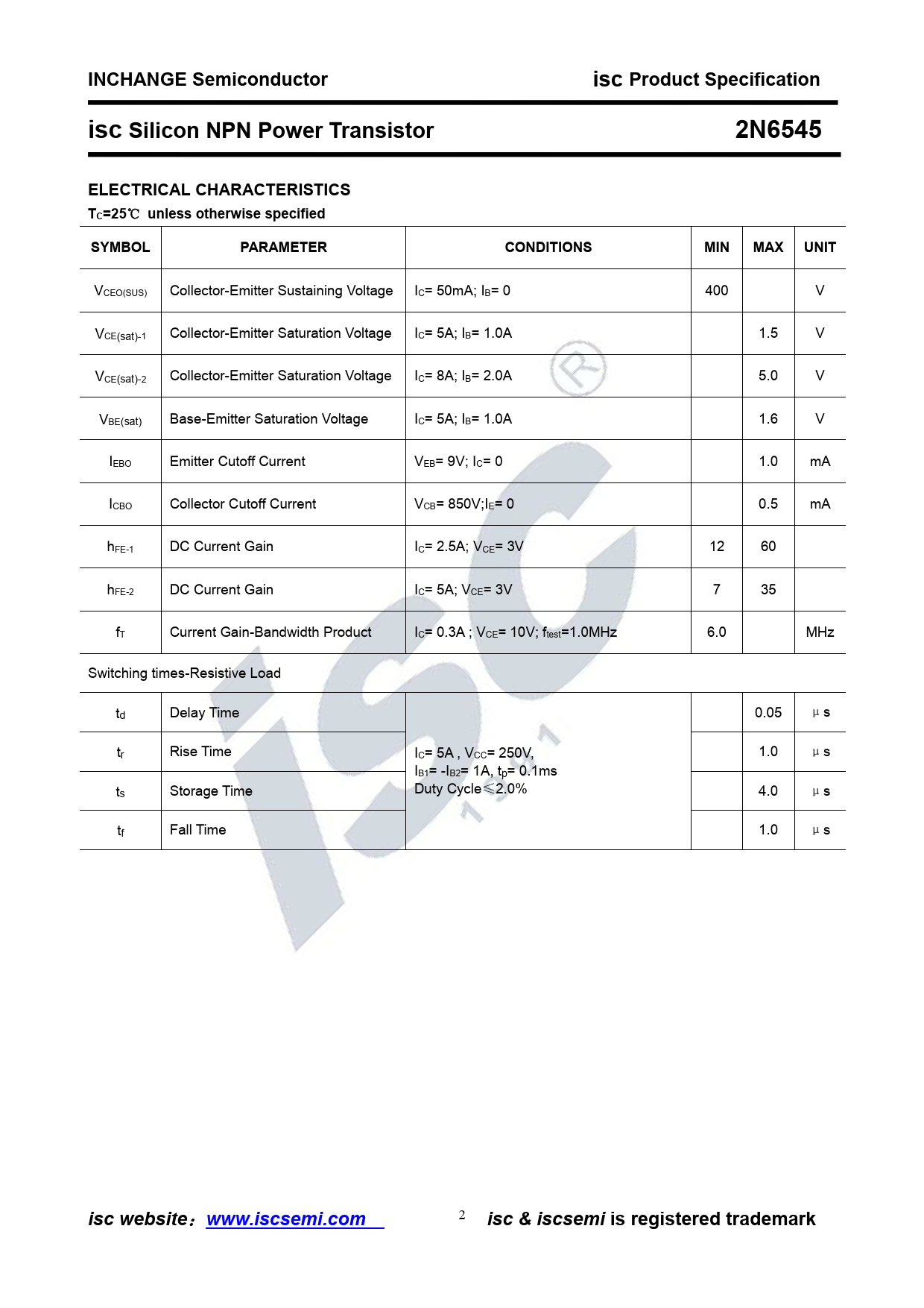 INCHANGE Semiconductor. isc Product Specification. isc Silicon NPN Power Transistor. 2N6545. ELECTRICAL CHARACTERISTICS TC=25