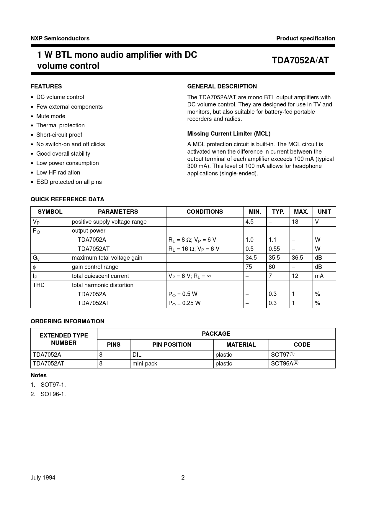 Datasheet TDA7052A, TDA7052AT (NXP) - 2
