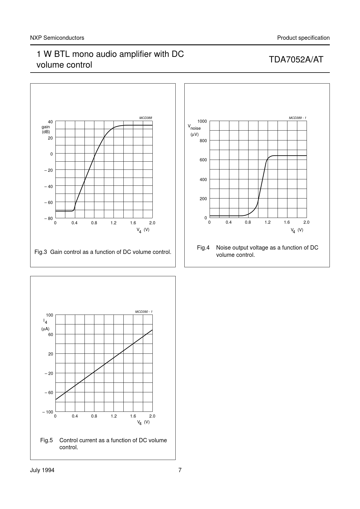 NXP Semiconductors Product specification 1 W BTL mono audio amplifier with DC TDA7052A/AT volume control MCD388 MCD389 - 1 40 1000 handbook, halfpage handbook, halfpage gain Vnoise (dB) (μV) 20 800 0 600 – 20 400 – 40 200 – 60 – 80 0 0 0.4 0.8 1.2 1.6 2.0 0 0.4 0.8 1.2 1.6 2.0 V (V) 4 V (V) 4 Fig.4 Noise output voltage as a function of DC Fig.3 Gain control as a function of DC volume control. volume control. MCD390 - 1 100 handbook, halfpage I4 (μA) 60 20 – 20 – 60 – 100 0 0.4 0.8 1.2 1.6 2.0 V (V) 4 Fig.5 Control current as a function of DC volume control. July 1994 7 Document Outline Features General description Missing Current Limiter (MCL) Quick reference data Ordering information Pinning Functional description Limiting values Thermal resistance Characteristics Application information Package outlines Soldering Introduction DIP SO Data sheet status Disclaimers