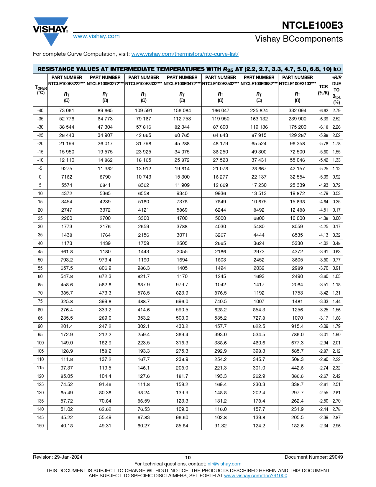 www.vishay.com Vishay BCcomponents For complete Curve Computation, visit: www.vishay.com/thermistors/ntc-curve-list/