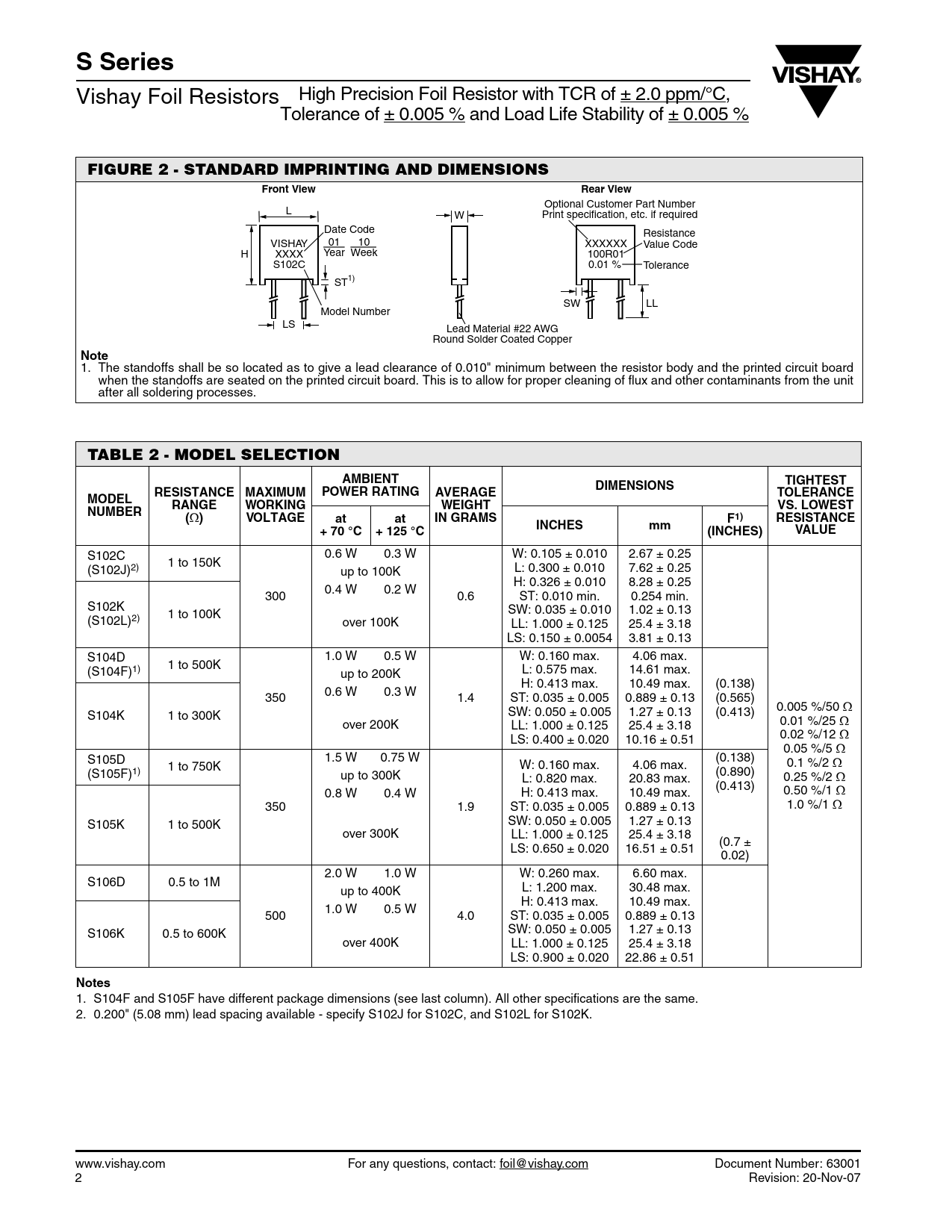 S Series Vishay Foil Resistors High Precision Foil Resistor with TCR of ± 2.0 ppm/°C, Tolerance of ± 0.005 % and Load Life Stability of ± 0.005 % FIGURE 2 - STANDARD IMPRINTING AND DIMENSIONSFront ViewRear View Optional Customer Part Number L W Print specification, etc. if required Date Code Resistance VISHAY 01 10 XXXXXX Value Code H XXXX Year Week 100R01 S102C 0.01 % Tolerance ST1) SW LL Model Number LS Lead Material #22 AWG Round Solder Coated Copper Note 1. The standoffs shall be so located as to give a lead clearance of 0.010" minimum between the resistor body and the printed circuit board when the standoffs are seated on the printed circuit board. This is to allow for proper cleaning of flux and other contaminants from the unit after all soldering processes. TABLE 2 - MODEL SELECTIONAMBIENTDIMENSIONSTIGHTESTRESISTANCE MAXIMUMPOWER RATINGAVERAGETOLERANCEMODELRANGEWORKINGWEIGHTVS. LOWESTNUMBER( Ω )VOLTAGEatatIN GRAMSF1)RESISTANCEINCHESmm+ 70 °C+ 125 °C(INCHES)VALUE S102C 0.6 W 0.3 W W: 0.105 ± 0.010 2.67 ± 0.25 (S102J)2) 1 to 150K L: 0.300 ± 0.010 7.62 ± 0.25 up to 100K H: 0.326 ± 0.010 8.28 ± 0.25 0.4 W 0.2 W 300 0.6 ST: 0.010 min. 0.254 min. S102K SW: 0.035 ± 0.010 1.02 ± 0.13 (S102L)2) 1 to 100K over 100K LL: 1.000 ± 0.125 25.4 ± 3.18 LS: 0.150 ± 0.0054 3.81 ± 0.13 S104D 1.0 W 0.5 W W: 0.160 max. 4.06 max. (S104F)1) 1 to 500K L: 0.575 max. 14.61 max. up to 200K H: 0.413 max. 10.49 max. (0.138) 0.6 W 0.3 W 350 1.4 ST: 0.035 ± 0.005 0.889 ± 0.13 (0.565) 0.005 %/50 Ω SW: 0.050 ± 0.005 1.27 ± 0.13 (0.413) S104K 1 to 300K 0.01 %/25 Ω over 200K LL: 1.000 ± 0.125 25.4 ± 3.18 0.02 %/12 Ω LS: 0.400 ± 0.020 10.16 ± 0.51 0.05 %/5 Ω S105D 1.5 W 0.75 W (0.138) W: 0.160 max. 4.06 max. 0.1 %/2 Ω (S105F)1) 1 to 750K (0.890) up to 300K L: 0.820 max. 20.83 max. 0.25 %/2 Ω (0.413) 0.8 W 0.4 W H: 0.413 max. 10.49 max. 0.50 %/1 Ω 350 1.9 ST: 0.035 ± 0.005 0.889 ± 0.13 1.0 %/1 Ω SW: 0.050 ± 0.005 1.27 ± 0.13 S105K 1 to 500K over 300K LL: 1.000 ± 0.125 25.4 ± 3.18 (0.7 ± LS: 0.650 ± 0.020 16.51 ± 0.51 0.02) 2.0 W 1.0 W W: 0.260 max. 6.60 max. S106D 0.5 to 1M L: 1.200 max. 30.48 max. up to 400K H: 0.413 max. 10.49 max. 1.0 W 0.5 W 500 4.0 ST: 0.035 ± 0.005 0.889 ± 0.13 SW: 0.050 ± 0.005 1.27 ± 0.13 S106K 0.5 to 600K over 400K LL: 1.000 ± 0.125 25.4 ± 3.18 LS: 0.900 ± 0.020 22.86 ± 0.51 Notes 1. S104F and S105F have different package dimensions (see last column). All other specifications are the same. 2. 0.200" (5.08 mm) lead spacing available - specify S102J for S102C, and S102L for S102K. www.vishay.com For any questions, contact: foil@vishay.com Document Number: 63001 2 Revision: 20-Nov-07 Document Outline Datasheet Disclaimer