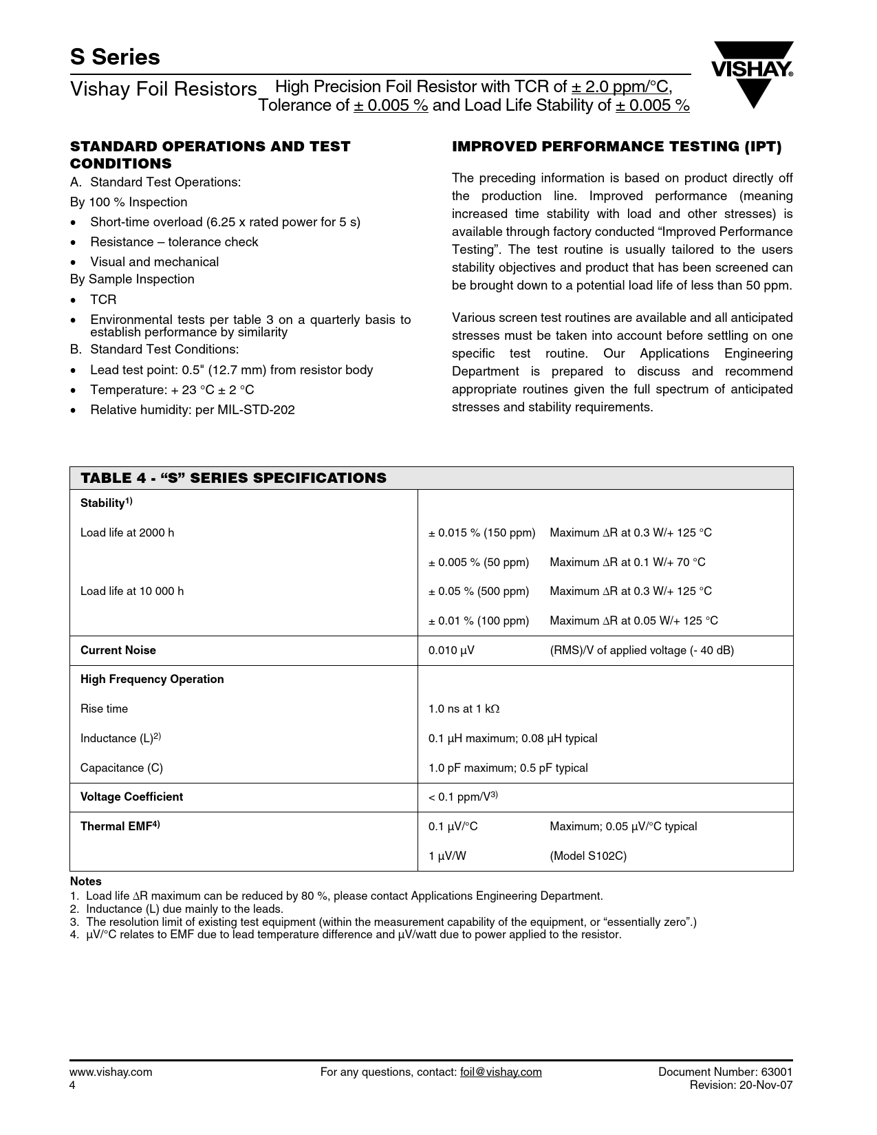 S Series Vishay Foil Resistors High Precision Foil Resistor with TCR of ± 2.0 ppm/°C, Tolerance of ± 0.005 % and Load Life Stability of ± 0.005 % STANDARD OPERATIONS AND TESTIMPROVED PERFORMANCE TESTING (IPT)CONDITIONS A. Standard Test Operations: The preceding information is based on product directly off the production line. Improved performance (meaning By 100 % Inspection • increased time stability with load and other stresses) is Short-time overload (6.25 x rated power for 5 s) available through factory conducted “Improved Performance • Resistance – tolerance check Testing”. The test routine is usually tailored to the users • Visual and mechanical stability objectives and product that has been screened can By Sample Inspection be brought down to a potential load life of less than 50 ppm. • TCR • Environmental tests per table 3 on a quarterly basis to Various screen test routines are available and all anticipated establish performance by similarity stresses must be taken into account before settling on one B. Standard Test Conditions: specific test routine. Our Applications Engineering • Lead test point: 0.5" (12.7 mm) from resistor body Department is prepared to discuss and recommend • Temperature: + 23 °C ± 2 °C appropriate routines given the full spectrum of anticipated • Relative humidity: per MIL-STD-202 stresses and stability requirements. TABLE 4 - “S” SERIES SPECIFICATIONSStability1) Load life at 2000 h ± 0.015 % (150 ppm) Maximum ΔR at 0.3 W/+ 125 °C ± 0.005 % (50 ppm) Maximum ΔR at 0.1 W/+ 70 °C Load life at 10 000 h ± 0.05 % (500 ppm) Maximum ΔR at 0.3 W/+ 125 °C ± 0.01 % (100 ppm) Maximum ΔR at 0.05 W/+ 125 °C Current Noise 0.010 µV (RMS)/V of applied voltage (- 40 dB) High Frequency Operation Rise time 1.0 ns at 1 kΩ Inductance (L)2) 0.1 µH maximum; 0.08 µH typical Capacitance (C) 1.0 pF maximum; 0.5 pF typical Voltage Coefficient < 0.1 ppm/V3) Thermal EMF4) 0.1 µV/°C Maximum; 0.05 µV/°C typical 1 µV/W (Model S102C) Notes 1. Load life ΔR maximum can be reduced by 80 %, please contact Applications Engineering Department. 2. Inductance (L) due mainly to the leads. 3. The resolution limit of existing test equipment (within the measurement capability of the equipment, or “essentially zero”.) 4. µV/°C relates to EMF due to lead temperature difference and µV/watt due to power applied to the resistor. www.vishay.com For any questions, contact: foil@vishay.com Document Number: 63001 4 Revision: 20-Nov-07 Document Outline Datasheet Disclaimer