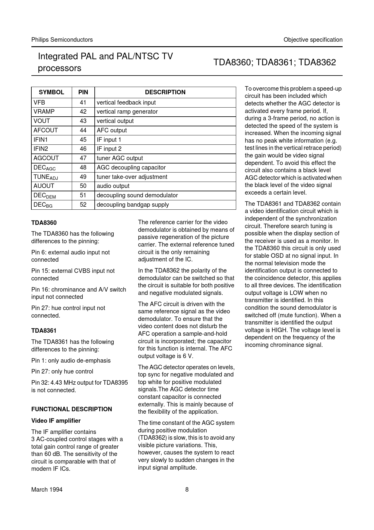 SYMBOL. PIN. DESCRIPTION. TDA8360. TDA8361. FUNCTIONAL DESCRIPTION. Video IF amplifier