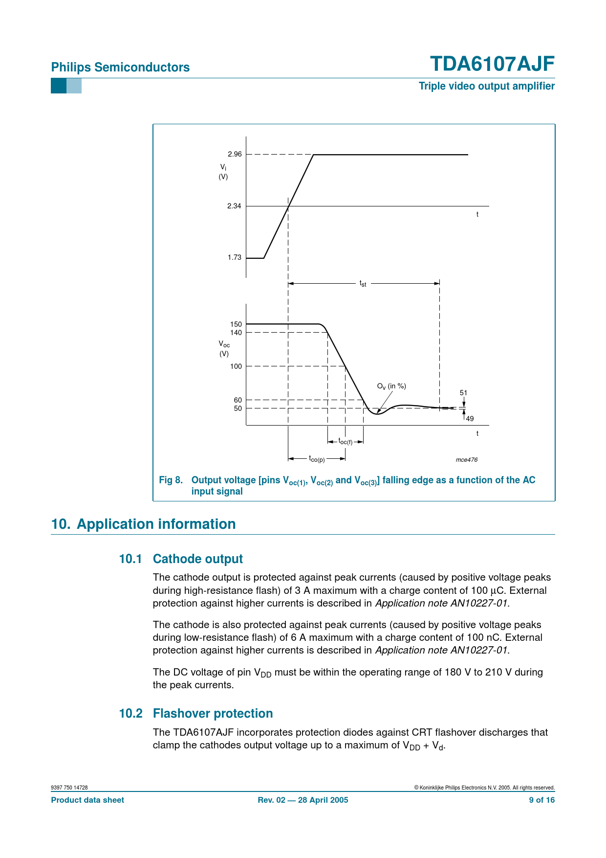 The TDA6107AJF incorporates protection diodes against CRT flashover discharges that clamp the cathodes output voltage up to a maximum of VDD + Vd. 9397 750 14728 © Koninklijke Philips Electronics N.V. 2005. All rights reserved.
