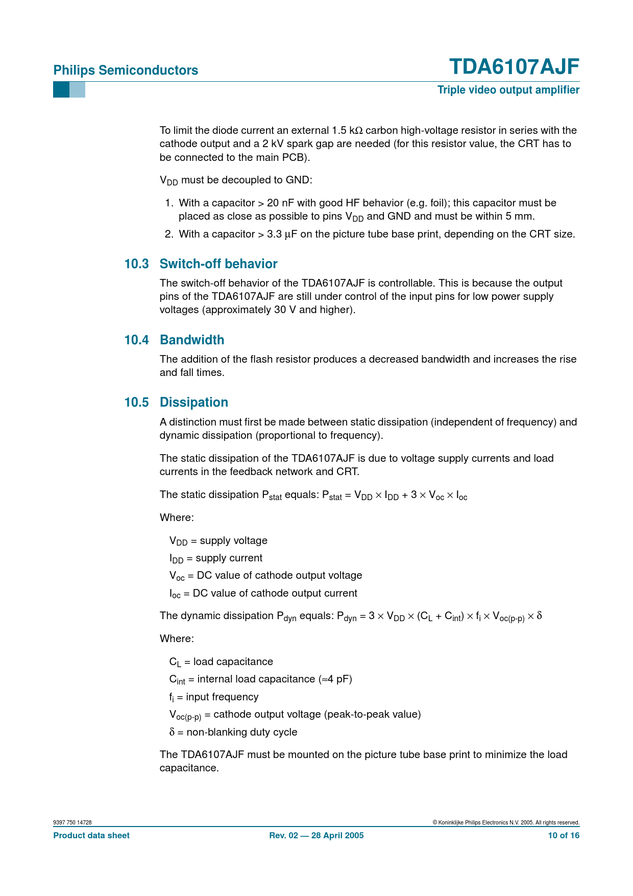 Philips Semiconductors. TDA6107AJF. Triple video output amplifier. 10.3 Switch-off behavior. 10.4 Bandwidth. 10.5 Dissipation