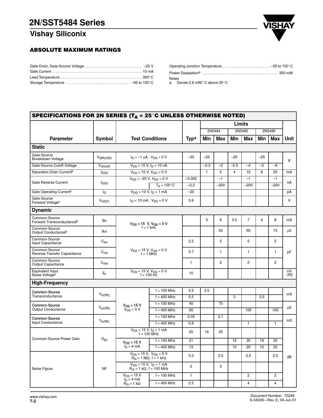 ABSOLUTE MAXIMUM RATINGS Gate-Drain, Gate-Source Voltage . –25 V Operating Junction Temperature . –55 to 150_C Gate Current . 10 mA Power Dissipationa . 350 mW Lead Temperature . 300_C Notes Storage Temperature . –65 to 150_C a. Derate 2.8 mW/_C above 25_C SPECIFICATIONS FOR 2N SERIES (TA = 25_C UNLESS OTHERWISE NOTED)