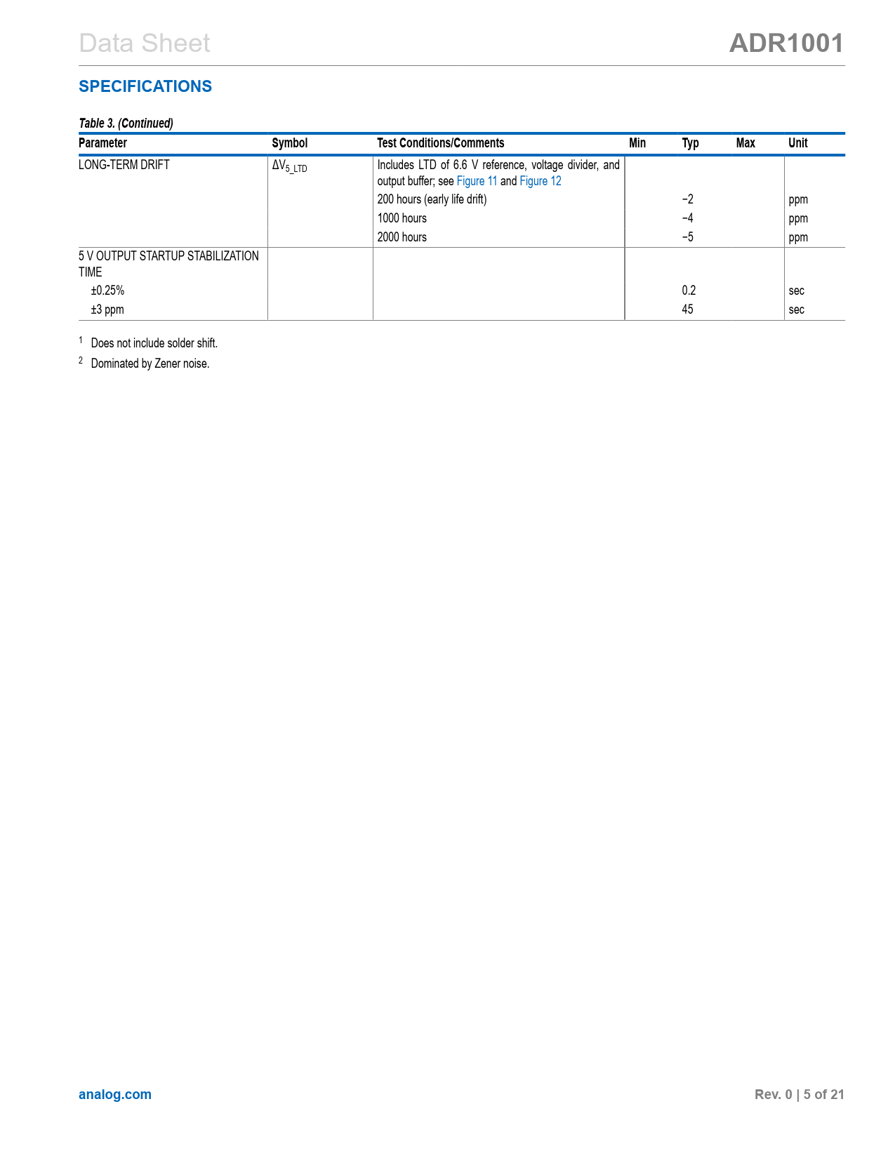 LONG-TERM DRIFT ΔV5_LTD Includes LTD of 6.6 V reference, voltage divider, and output buffer; see Figure 11 and Figure 12 200 hours (early life drift) −2 ppm 1000 hours −4 ppm 2000 hours −5 ppm 5 V OUTPUT STARTUP STABILIZATION TIME ±0.25% 0.2 sec ±3 ppm 45 sec 1 Does not include solder shift. 2 Dominated by Zener noise.