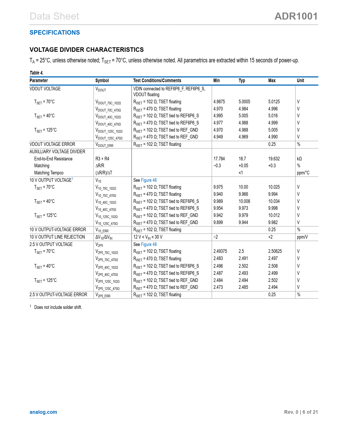 | Pages / Page | 21 / 6 — ADR1001. SPECIFICATIONS. VOLTAGE DIVIDER CHARACTERISTICS. Table 4. … |