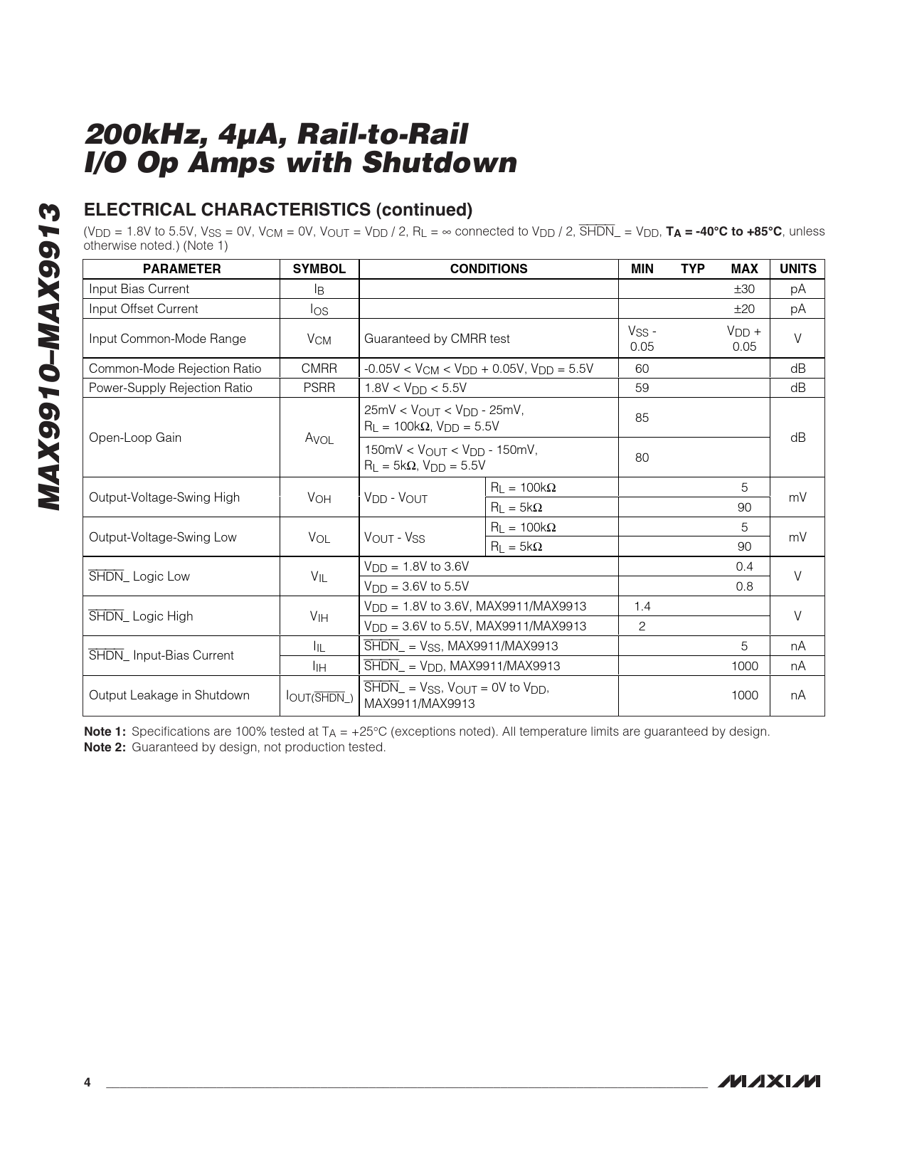 200kHz, 4µA, Rail-to-Rail I/O Op Amps with Shutdown. ELECTRICAL CHARACTERISTICS (continued). TA = -40°C to +85°C. PARAMETER