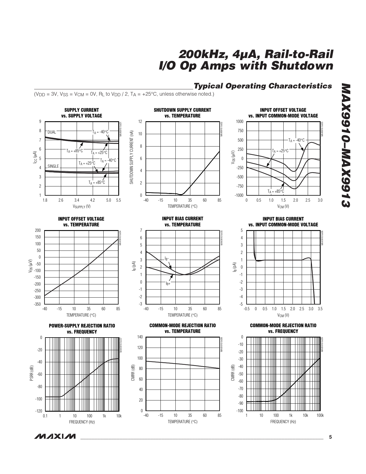 SUPPLY CURRENT SHUTDOWN SUPPLY CURRENT INPUT OFFSET VOLTAGE vs. SUPPLY VOLTAGE vs. TEMPERATURE vs. INPUT COMMON-MODE VOLTAGE