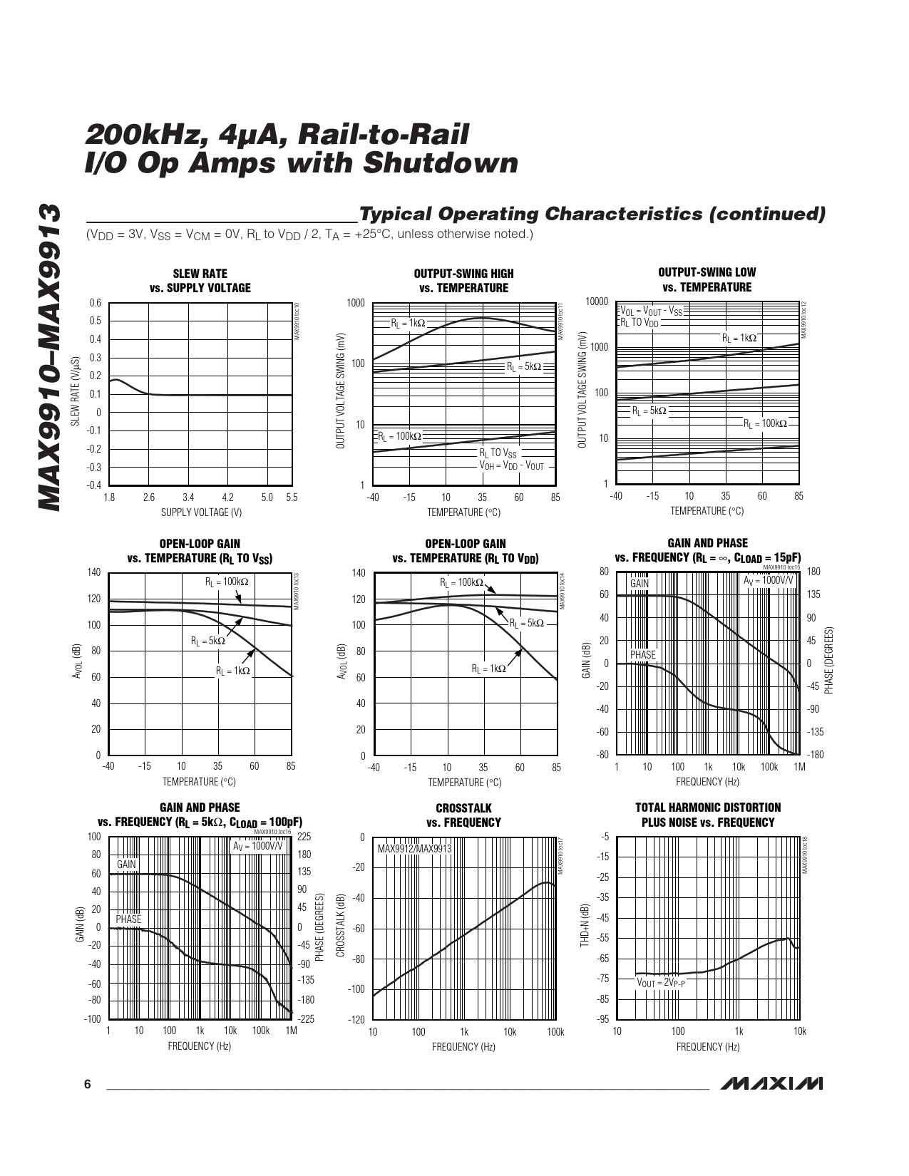 0.6 1000 10000 VOL = VOUT - VSS 0.5 RL = 1kΩ RL TO VDD MAX9910 toc10 0.4 MAX9910 toc11 MAX9910 toc12 RL = 1kΩ 1000 0.3 µS) 100 RL = 5kΩ 0.2 0.1 100 0 RL = 5kΩ SLEW RATE (V/ 10 RL = 100kΩ -0.1 RL = 100kΩ 10 -0.2 OUTPUT VOLTAGE SWING (mV) OUTPUT VOLTAGE SWING (mV) RL TO VSS -0.3 VOH = VDD - VOUT -0.4 1 1