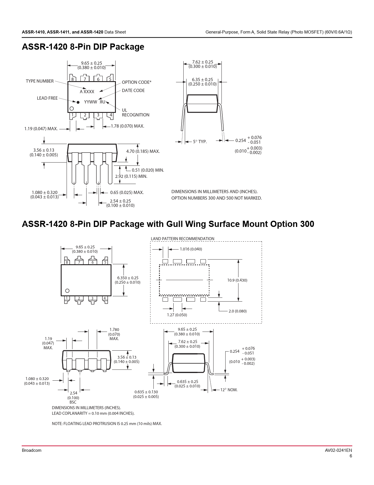 LAND PATTERN RECOMMENDATION 9.65 ± 0.25 (0.380 ± 0.010) 1.016 (0.040) 8 7 6 5 6.350 ± 0.25 (0.250 ± 0.010) 10.9 (0.430) 1 2 3 4 2.0 (0.080) 1.27 (0.050) 1.780 9.65 ± 0.25 (0.070) (0.380 ± 0.010) 1.19 MAX. 7.62 ± 0.25 (0.047) (0.300 ± 0.010) MAX. + 0.076 0.254 - 0.051 3.56 ± 0.13 + 0.003) (0.140 ± 0.005) (0.010 - 0.002) 1.080 ± 0.320 0.635 ± 0.25 (0.043 ± 0.013) (0.025 ± 0.010) 12° NOM. 0.635 ± 0.130 2.54 (0.025 ± 0.005) (0.100) BSC DIMENSIONS IN MILLIMETERS (INCHES). LEAD COPLANARITY = 0.10 mm (0.004 INCHES). NOTE: FLOATING LEAD PROTRUSION IS 0.25 mm (10 mils) MAX. Broadcom AV02-0241EN6 Document Outline Description Features Applications Functional Diagram Truth Table Ordering Information Schematics ASSR-1410 ASSR-1411 Connection A ASSR-1411 Connection B ASSR-1420 Package Outline Drawings ASSR-1410 4-Pin Small Outline Package ASSR-1411 6-Pin DIP Package ASSR-1411 6-Pin DIP Package with Gull Wing Surface Mount Option 300 ASSR-1420 8-Pin DIP Package ASSR-1420 8-Pin DIP Package with Gull Wing Surface Mount Option 300 Solder Reflow Profile Regulatory Information Insulation and Safety Related Specifications Absolute Maximum Ratings Recommended Operating Conditions Package Characteristics Electrical Specifications (DC) Switching Specifications (AC) Applications Information On-Resistance and Derating Curves Turn-On Time and Turn-Off Time Variation