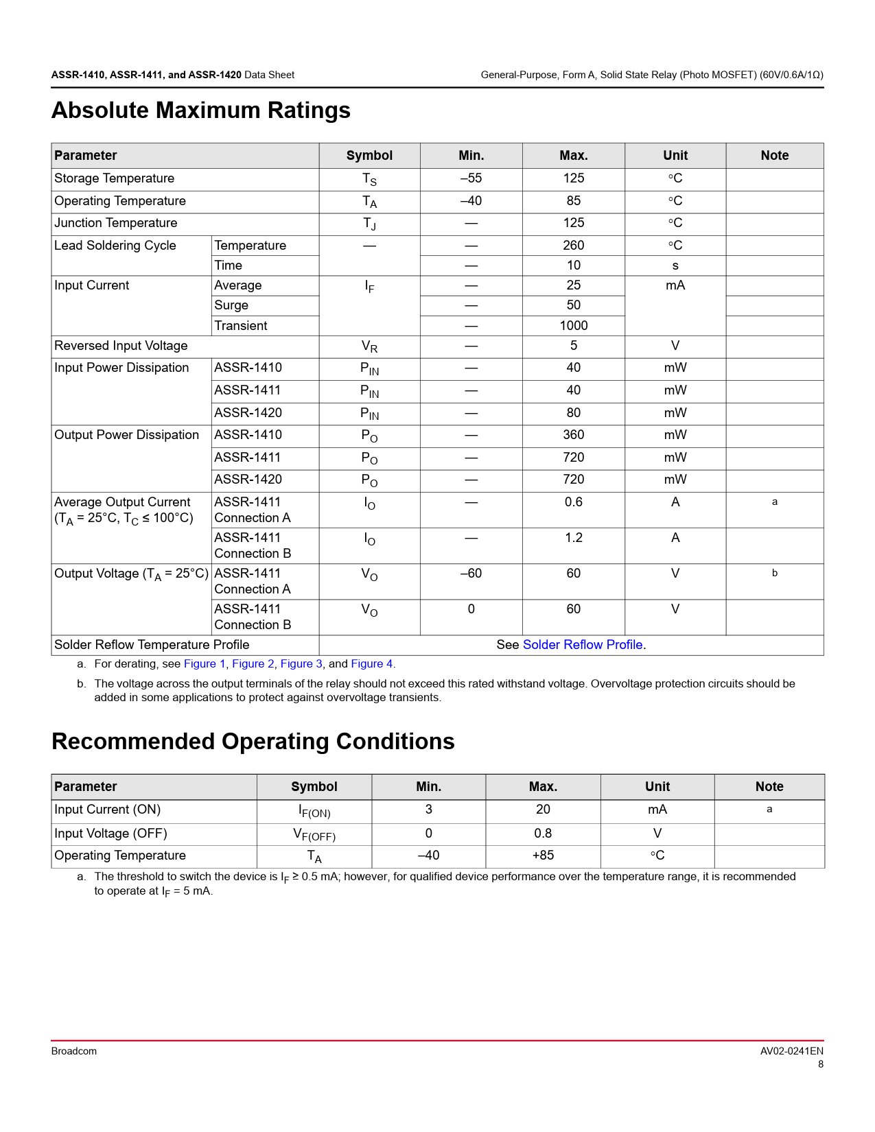 link to page 7 link to page 11 link to page 11 link to page 11 link to page 11 ASSR-1410, ASSR-1411, and ASSR-1420 Data Sheet General-Purpose, Form A, Solid State Relay (Photo MOSFET) (60V/0.6A/1Ω) Absolute Maximum RatingsParameterSymbolMin.Max.UnitNote Storage Temperature TS –55 125 °C Operating Temperature TA –40 85 °C Junction Temperature TJ — 125 °C Lead Soldering Cycle Temperature — — 260 °C Time — 10 s Input Current Average IF — 25 mA Surge — 50 Transient — 1000 Reversed Input Voltage VR — 5 V Input Power Dissipation ASSR-1410 PIN — 40 mW ASSR-1411 PIN — 40 mW ASSR-1420 PIN — 80 mW Output Power Dissipation ASSR-1410 PO — 360 mW ASSR-1411 PO — 720 mW ASSR-1420 PO — 720 mW Average Output Current ASSR-1411 IO — 0.6 A a (TA = 25°C, TC ≤ 100°C) Connection A ASSR-1411 IO — 1.2 A Connection B Output Voltage (TA = 25°C) ASSR-1411 VO –60 60 V b Connection A ASSR-1411 VO 0 60 V Connection B Solder Reflow Temperature Profile See Solder Reflow Profile. a. For derating, see Figure 1, Figure 2, Figure 3, and Figure 4. b. The voltage across the output terminals of the relay should not exceed this rated withstand voltage. Overvoltage protection circuits should be added in some applications to protect against overvoltage transients. Recommended Operating ConditionsParameterSymbolMin.Max.UnitNote Input Current (ON) IF(ON) 3 20 mA a Input Voltage (OFF) VF(OFF) 0 0.8 V Operating Temperature TA –40 +85 °C a. The threshold to switch the device is IF ≥ 0.5 mA; however, for qualified device performance over the temperature range, it is recommended to operate at IF = 5 mA. Broadcom AV02-0241EN8 Document Outline Description Features Applications Functional Diagram Truth Table Ordering Information Schematics ASSR-1410 ASSR-1411 Connection A ASSR-1411 Connection B ASSR-1420 Package Outline Drawings ASSR-1410 4-Pin Small Outline Package ASSR-1411 6-Pin DIP Package ASSR-1411 6-Pin DIP Package with Gull Wing Surface Mount Option 300 ASSR-1420 8-Pin DIP Package ASSR-1420 8-Pin DIP Package with Gull Wing Surface Mount Option 300 Solder Reflow Profile Regulatory Information Insulation and Safety Related Specifications Absolute Maximum Ratings Recommended Operating Conditions Package Characteristics Electrical Specifications (DC) Switching Specifications (AC) Applications Information On-Resistance and Derating Curves Turn-On Time and Turn-Off Time Variation