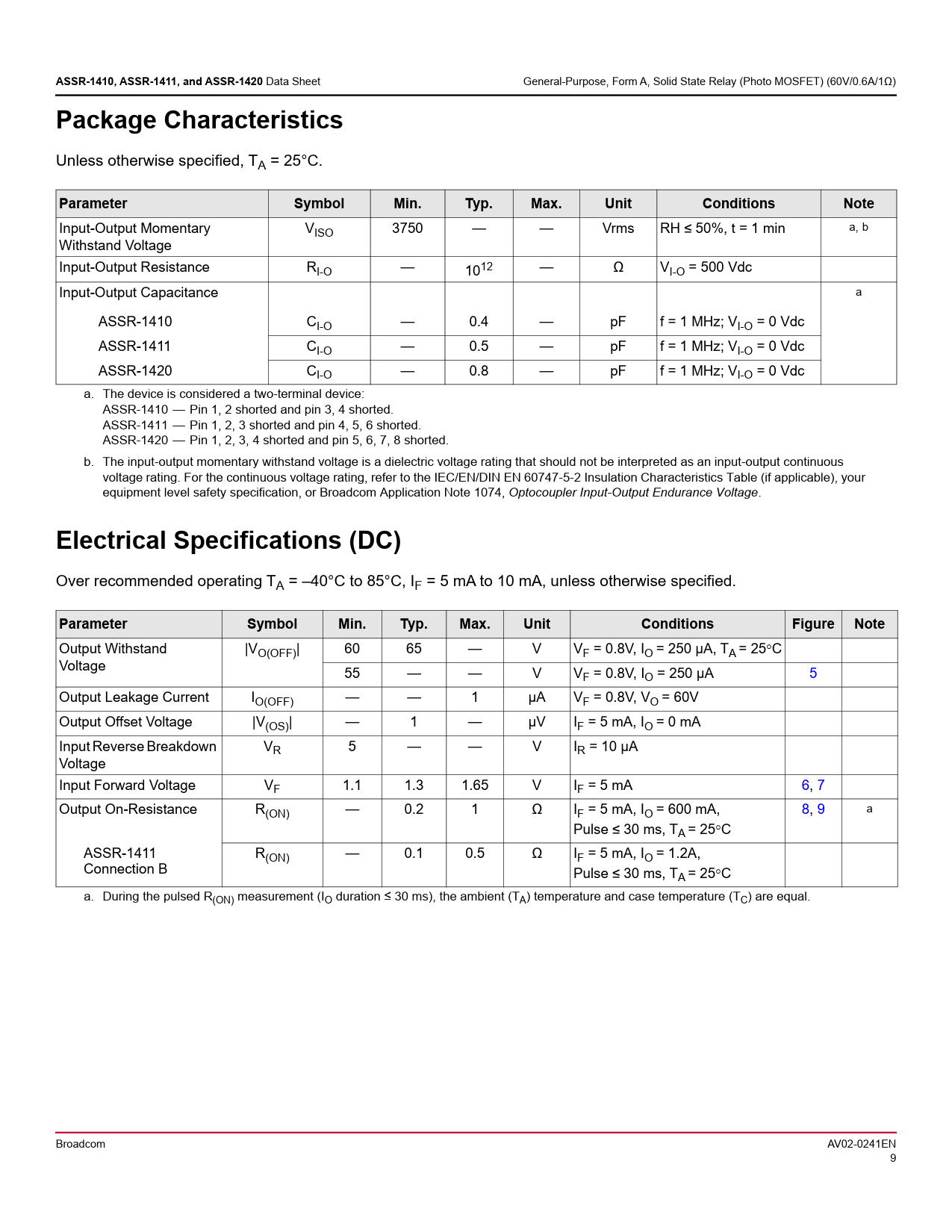 Output Withstand |VO(OFF)| 60 65 — V VF = 0.8V, IO = 250 μA, TA = 25°C Voltage 55 — — V VF = 0.8V, IO = 250 μA 5 Output Leakage Current IO(OFF) — — 1 μA VF = 0.8V, VO = 60V Output Of set Voltage |V(OS)| — 1 — μV IF = 5 mA, IO = 0 mA Input Reverse Breakdown VR 5 — — V IR = 10 μA Voltage Input Forward Voltage VF 1.1 1.3 1.65 V IF = 5 mA 6, 7 Output On-Resistance R(ON) — 0.2 1 Ω IF = 5 mA, IO = 600 mA, 8, 9 a Pulse ≤ 30 ms, TA = 25°C ASSR-1411 R(ON) — 0.1 0.5 Ω IF = 5 mA, IO = 1.2A, Connection B Pulse ≤ 30 ms, TA = 25°C a. During the pulsed R(ON) measurement (IO duration ≤ 30 ms), the ambient (TA) temperature and case temperature (TC) are equal. Broadcom AV02-0241EN9 Document Outline Description Features Applications Functional Diagram Truth Table Ordering Information Schematics ASSR-1410 ASSR-1411 Connection A ASSR-1411 Connection B ASSR-1420 Package Outline Drawings ASSR-1410 4-Pin Small Outline Package ASSR-1411 6-Pin DIP Package ASSR-1411 6-Pin DIP Package with Gull Wing Surface Mount Option 300 ASSR-1420 8-Pin DIP Package ASSR-1420 8-Pin DIP Package with Gull Wing Surface Mount Option 300 Solder Reflow Profile Regulatory Information Insulation and Safety Related Specifications Absolute Maximum Ratings Recommended Operating Conditions Package Characteristics Electrical Specifications (DC) Switching Specifications (AC) Applications Information On-Resistance and Derating Curves Turn-On Time and Turn-Off Time Variation
