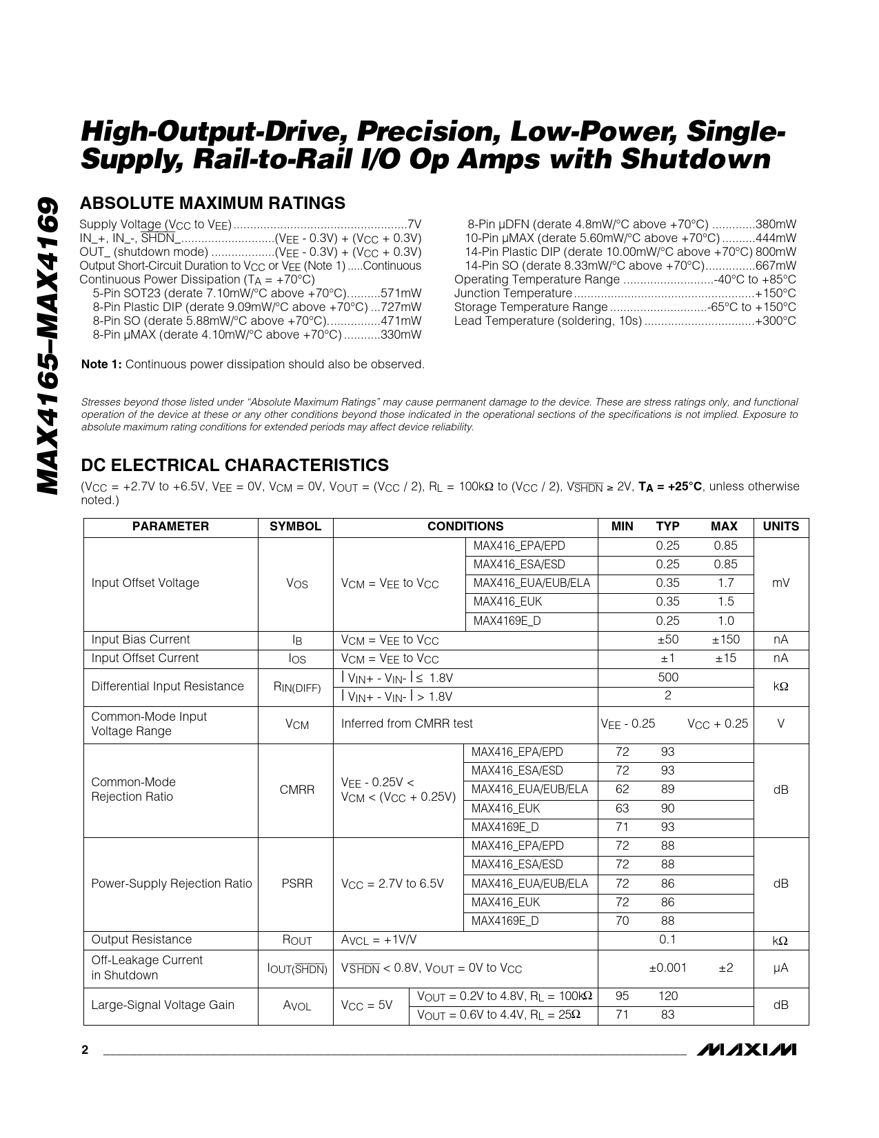 High-Output-Drive, Precision, Low-Power, Single- Supply, Rail-to-Rail I/O Op Amps with ShutdownABSOLUTE MAXIMUM RATINGS Supply Voltage (VCC to VEE) ..7V 8-Pin µDFN (derate 4.8mW/°C above +70°C) ...380mW IN_+, IN_-, SHDN_..(VEE - 0.3V) + (VCC + 0.3V) 10-Pin µMAX (derate 5.60mW/°C above +70°C) ..444mW OUT_ (shutdown mode) ...(VEE - 0.3V) + (VCC + 0.3V) 14-Pin Plastic DIP (derate 10.00mW/°C above +70°C) 800mW Output Short-Circuit Duration to VCC or VEE (Note 1) ...Continuous 14-Pin SO (derate 8.33mW/°C above +70°C)...667mW Continuous Power Dissipation (TA = +70°C) Operating Temperature Range ...-40°C to +85°C 5-Pin SOT23 (derate 7.10mW/°C above +70°C)..571mW Junction Temperature ..+150°C 8-Pin Plastic DIP (derate 9.09mW/°C above +70°C) ...727mW Storage Temperature Range ...-65°C to +150°C 8-Pin SO (derate 5.88mW/°C above +70°C)..471mW Lead Temperature (soldering, 10s) ...+300°C 8-Pin µMAX (derate 4.10mW/°C above +70°C) ...330mW Note 1: Continuous power dissipation should also be observed. Stresses beyond those listed under “Absolute Maximum Ratings” may cause permanent damage to the device. These are stress ratings only, and functional operation of the device at these or any other conditions beyond those indicated in the operational sections of the specifications is not implied. Exposure to absolute maximum rating conditions for extended periods may affect device reliability. DC ELECTRICAL CHARACTERISTICSMAX4165–MAX4169 (VCC = +2.7V to +6.5V, VEE = 0V, VCM = 0V, VOUT = (VCC / 2), RL = 100kΩ to (VCC / 2), VSHDN ≥ 2V, TA = +25°C , unless otherwise noted.) PARAMETER SYMBOLCONDITIONSMINTYPMAXUNITS MAX416_EPA/EPD 0.25 0.85 MAX416_ESA/ESD 0.25 0.85 Input Offset Voltage VOS VCM = VEE to VCC MAX416_EUA/EUB/ELA 0.35 1.7 mV MAX416_EUK 0.35 1.5 MAX4169E_D 0.25 1.0 Input Bias Current IB VCM = VEE to VCC ±50 ±150 nA Input Offset Current IOS VCM = VEE to VCC ±1 ±15 nA | V ≤ 500 Differential Input Resistance R IN+ - VIN- | 1.8V IN(DIFF) kΩ | VIN+ - VIN- | > 1.8V 2 Common-Mode Input V Voltage Range CM Inferred from CMRR test VEE - 0.25 VCC + 0.25 V MAX416_EPA/EPD 72 93 MAX416_ESA/ESD 72 93 Common-Mode V CMRR EE - 0.25V < MAX416_EUA/EUB/ELA 62 89 dB Rejection Ratio VCM < (VCC + 0.25V) MAX416_EUK 63 90 MAX4169E_D 71 93 MAX416_EPA/EPD 72 88 MAX416_ESA/ESD 72 88 Power-Supply Rejection Ratio PSRR VCC = 2.7V to 6.5V MAX416_EUA/EUB/ELA 72 86 dB MAX416_EUK 72 86 MAX4169E_D 70 88 Output Resistance ROUT AVCL = +1V/V 0.1 kΩ Off-Leakage Current I in Shutdown OUT(SHDN) VSHDN < 0.8V, VOUT = 0V to VCC ±0.001 ±2 μA VOUT = 0.2V to 4.8V, RL = 100kΩ 95 120 Large-Signal Voltage Gain AVOL VCC = 5V dB VOUT = 0.6V to 4.4V, RL = 25Ω 71 83 2_______________________________________________________________________________________