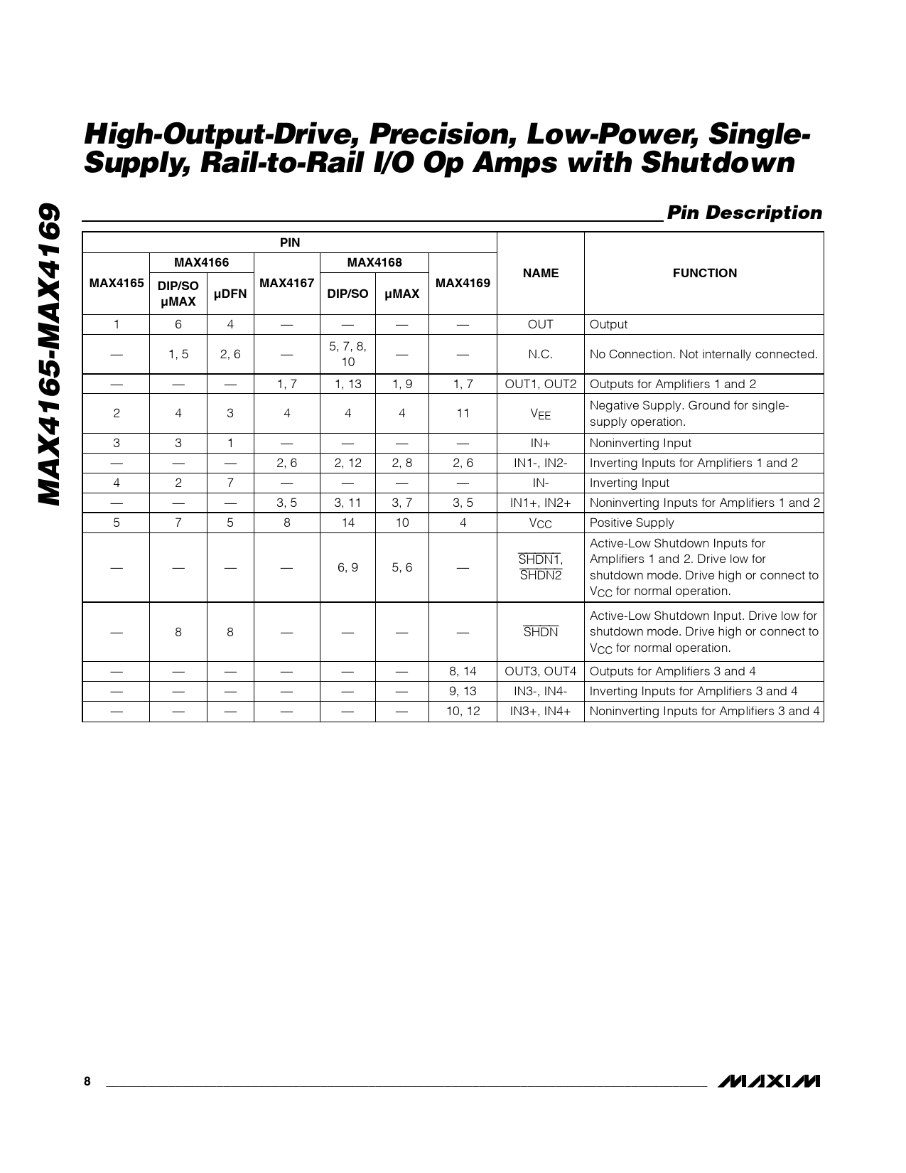 High-Output-Drive, Precision, Low-Power, Single- Supply, Rail-to-Rail I/O Op Amps with Shutdown Pin Description PIN MAX4166 MAX4168 NAME FUNCTION MAX4165 DIP/SO MAX4167 MAX4169 DIP/SO (MAX (MAX (DFN