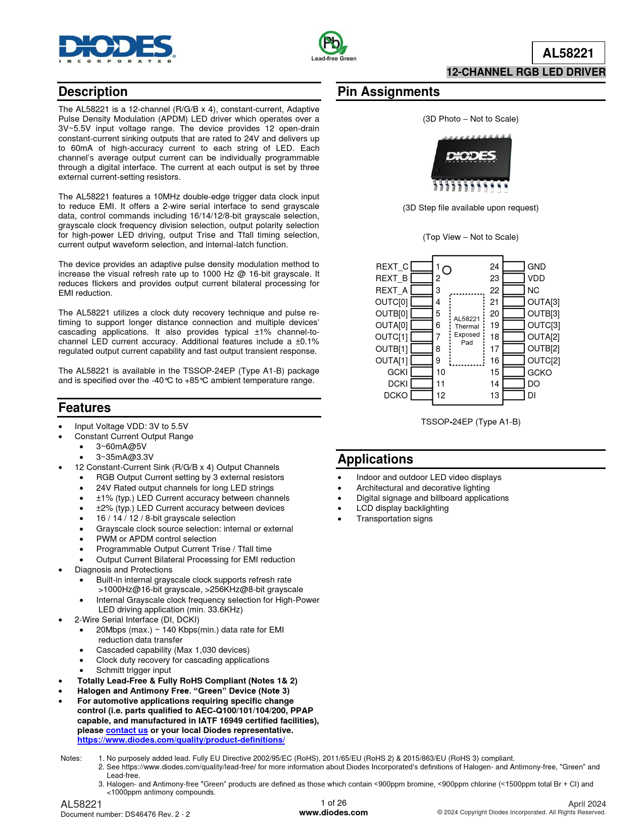 AL58221. 12-CHANNEL RGB LED DRIVER. Description. Pin Assignments. Features. Applications