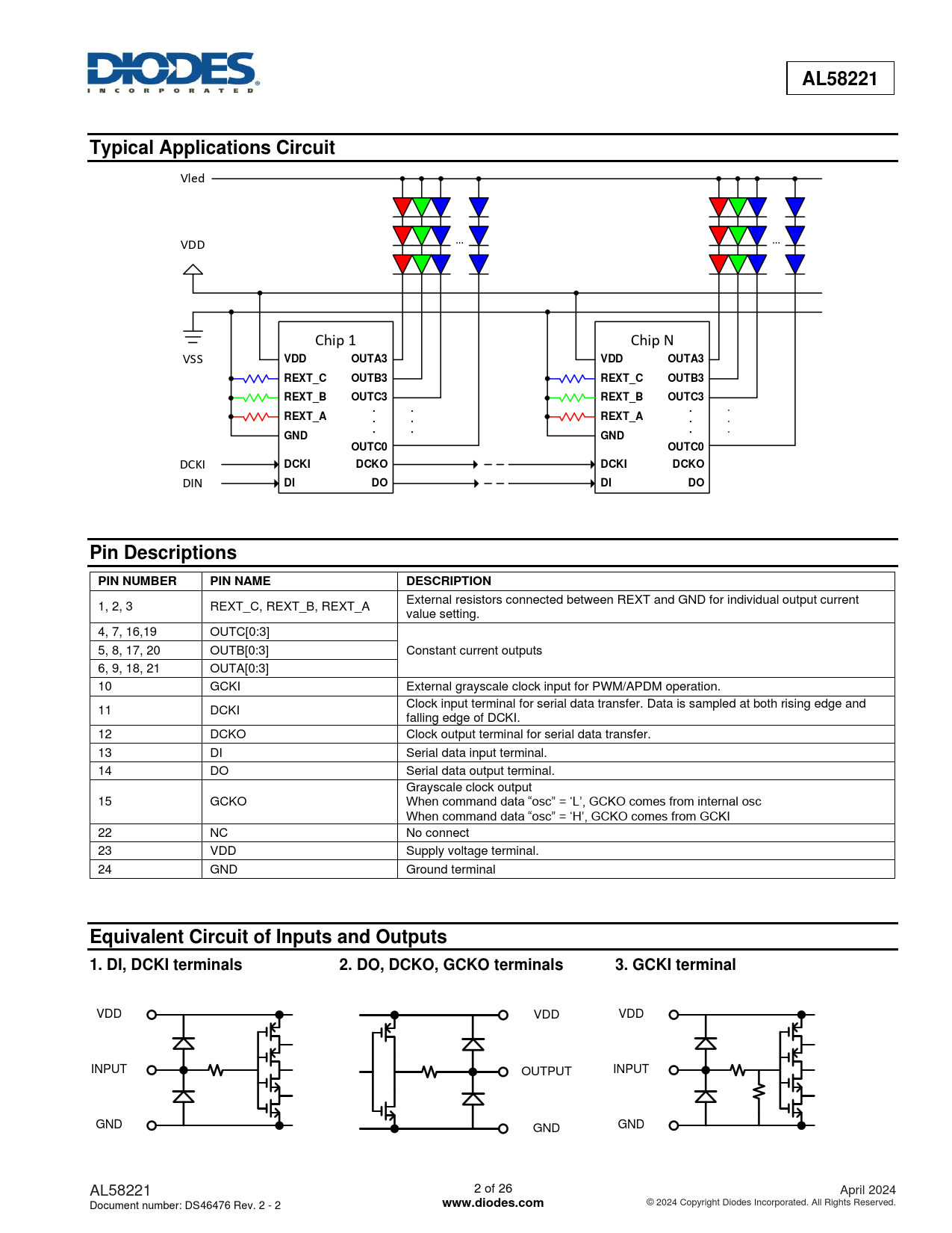 AL58221. Typical Applications Circuit. VDD. OUTA3. REXT_C. OUTB3. REXT_B. OUTC3. REXT_A. GND. OUTC0. DCKI. DCKO. Pin Descriptions. PIN NUMBER